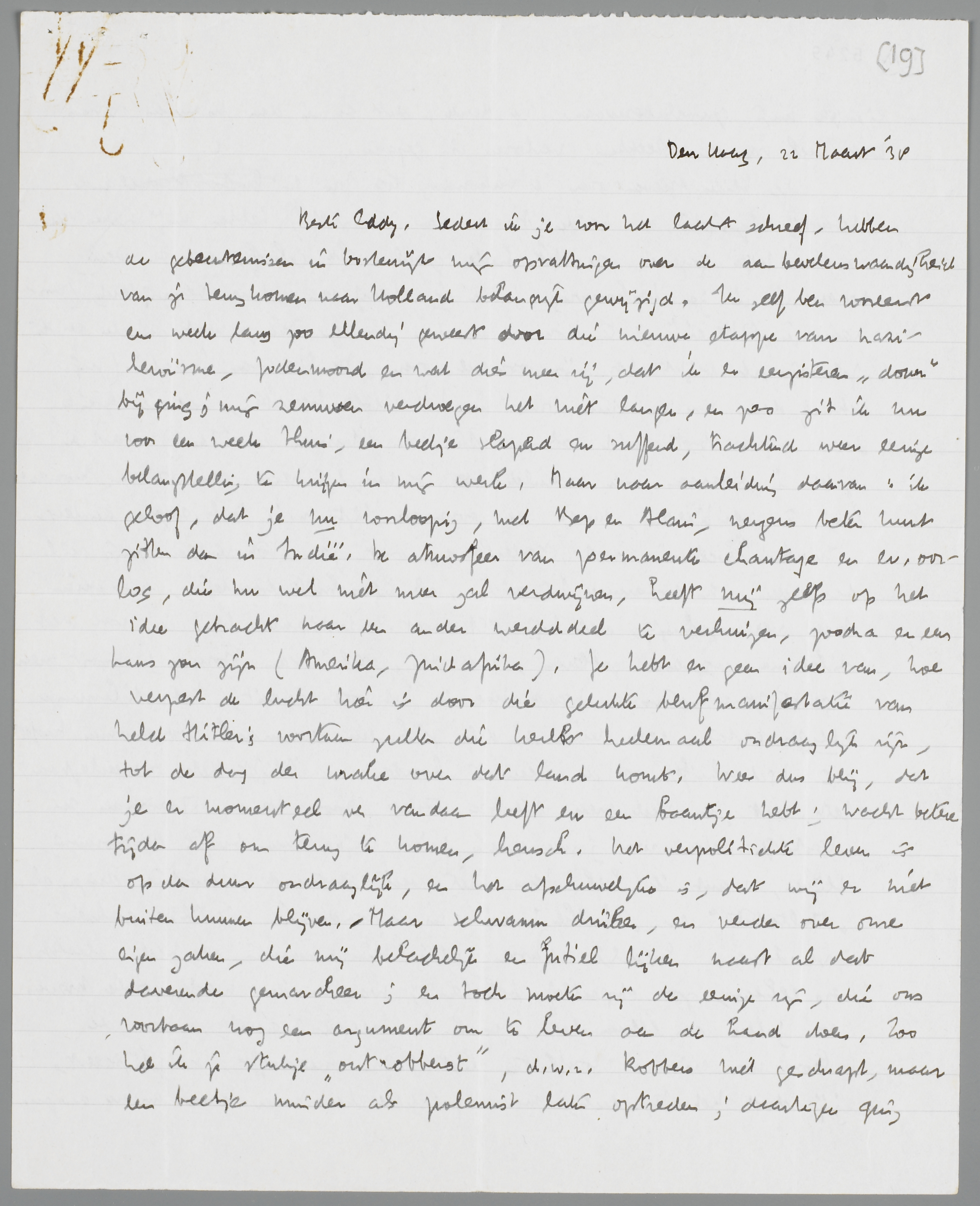 Sedert ik je voor het laatst schreef, hebben de gebeurtenissen in Oostenrijk mijn opvattingen over de aanbevelenswaardigheid van je terugkomen naar Holland belangrijk gewijzigd. Ik zelf ben vooreerst een week lang zoo ellendig geweest door die nieuwe etappe van naziheroïsme, Jodenmoord en wat dies meer zij, dat ik er eergisteren ‘down’ bij ging; mijn zenuwen verdroegen het niet langer, en zoo zit ik nu voor een week thuis, een beetje slapend en suffend, trachtend weer eenige belangstelling te krijgen in mijn werk. Maar naar aanleiding daarvan: ik geloof, dat je nu voorloopig, met Bep en Alain, nergens beter kunt zitten dan in Indië. De atmosfeer van permanente chantage en ev. oorlog, die nu wel niet meer zal verdwijnen, heeft mij zelfs op het idee gebracht naar een ander werelddeel te verhuizen, zoodra er een kans zou zijn (Amerika, Zuidafrika). Je hebt er geen idee van, hoe verpest de lucht hier is door die gelukte blufmanifestatie van held Hitler; voortaan zullen die kerels heelemaal ondraaglijk zijn, tot de dag der wrake over dat land komt. Wees dus blij, dat je er momenteel ver vandaan leeft en een baantje hebt; wacht betere tijden af om terug te komen, heusch. Het verpolitiekte leven is op den duur ondraaglijk, en het afschuwelijke is, dat wij er niet buiten kunnen blijven. - Maar schwamm drüber, en verder over onze eigen zaken, die mij belachelijk en futiel lijken naast al dat daverende gemarcheer; en toch moeten zij de eenige zijn, die ons voortaan nog een argument om te leven aan de hand doen. Zoo heb ik je stukje ‘ontrobberst’, d.w.z. Robbers niet geschrapt, maar een beetje minder als polemist laten optreden; daartegen ging eigenlijk mijn gevoelsbezwaar. Ik denk, dat er in den nieuwen vorm niet veel van de strekking verloren is gegaan.