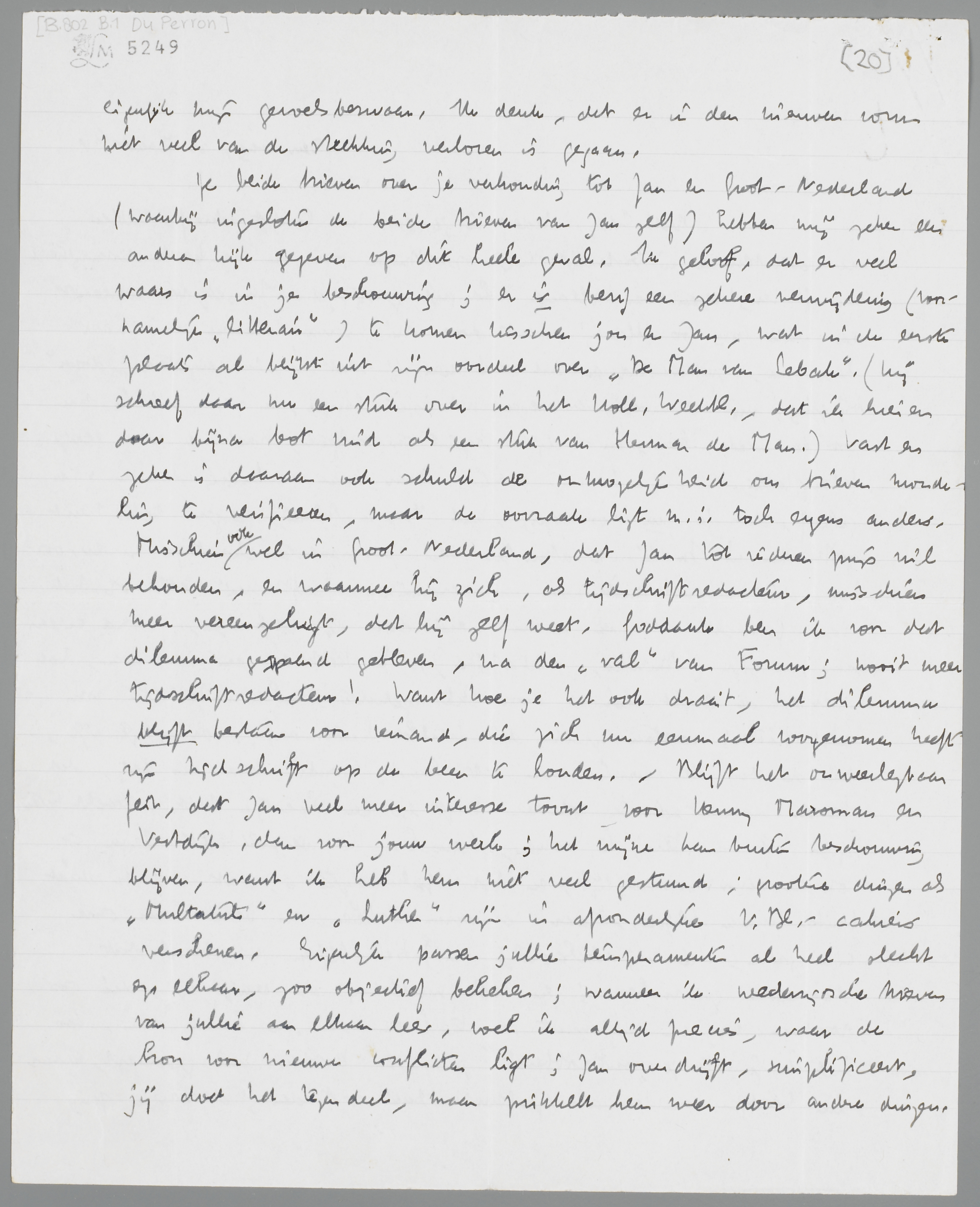 Bep vraagt mij om over Ant te schrijven. Nu, ik ben te beroerd om goed te schrijven, maar dit kan ik wel zeggen: zonder haar was ik momenteel niet in staat het hoofd boven water te houden. Zij heeft meer gewone vitaliteit dan ik, en minder behoefte aan cultuur, maar zij begrijpt precies, hoe voor mij die twee dingen in elkaar grijpen. Meer heb ik niet noodig; ik heb zelden zoozeer het gevoel gehad als in deze dagen van volkomen lusteloosheid en onverschilligheid tegenover mijn werk, dat ik gelukkig getrouwd ben, en dat ook daarin een stuk ‘einmalige’ cultuur steekt, dat met abstracte recepten over ‘het’ huwelijk en ‘de’ liefde spot. Ja, zelfs de uitdrukking ‘gelukkig getrouwd’ is al paskwillig, want die term legt precies de nadruk op wat weer algemeen en dus onpersoonlijk-secundair is: het geluk en het trouwen. Primair is, dat wij ons de heele onderneming leven moeilijk meer zonder deze ‘eenheid’ zouden kunnen voorstellen, ik misschien minder nog dan Ant, die in wezen veel fatalistischer is dan ik. Ik ontdek steeds meer beschamende dingen in mezelf, zoo b.v. de begeerte om nog lang te leven, en (contra Nietzsche, althans in politieken zin) ongevaarlijk te leven. Neem voor ditmaal dit geklets in de ruimte, met enkele lichtpunten hoop ik, zoo het punt Ant, want dat moet dunkt mij ook via dezen stijl nog iets lichtends hebben, voor lief. Spoedig beter. Hartelijke groeten onder ons vieren, en een hand met extra kracht