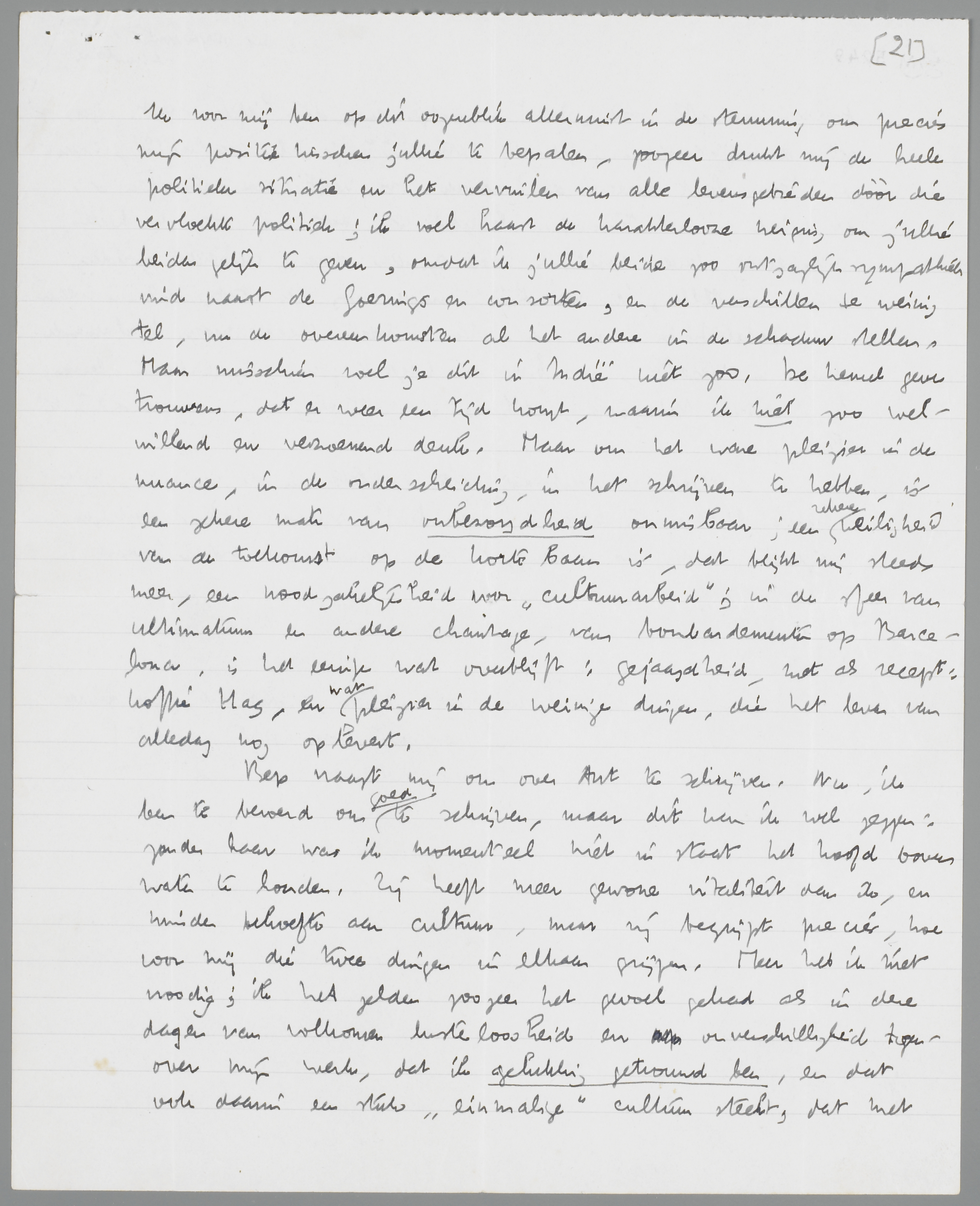 Je beide brieven over je verhouding tot Jan en Groot-Nederland (waarbij ingesloten de beide brieven van Jan zelf) hebben mij zeker een anderen kijk gegeven op dit heele geval. Ik geloof, dat er veel waars is in je beschouwing; er is bezig een zekere verwijdering (voornamelijk ‘litterair’) te komen tusschen jou en Jan, wat in de eerste plaats al blijkt uit zijn oordeel over De Man van Lebak. (Hij schreef daar nu een stuk over in het Holl. Weekbl., dat ik hier en daar bijna bot vind als een stuk van Herman de Man). Vast en zeker is daaraan ook schuld de onmogelijkheid om brieven mondeling te verifieeren, maar de oorzaak ligt m.i. toch ergens anders. Misschien ook wel in Groot-Nederland, dat Jan tot iederen prijs wil behouden, en waarmee hij zich, als tijdschriftredacteur, misschien meer vereenzelvigt, dan hij zelf weet. Goddank ben ik voor dat dilemma gespaard gebleven, na den ‘val’ van Forum; nooit meer tijdschriftredacteur! Want hoe je het ook draait, het dilemma blijft bestaan voor iemand, die zich nu eenmaal voorgenomen heeft zijn tijdschrift op de been te houden. - Blijft het onweerlegbaar feit, dat Jan veel meer interesse toont voor Henny Marsman en Vestdijk, dan voor jouw werk; het mijne kan buiten beschouwing blijven, want ik heb hem niet veel gestuurd; grootere dingen als Multatuli en Luther zijn in afzonderlijke V.Bl.-cahiers verschenen. Eigenlijk passen jullie temperamenten al heel slecht op elkaar, zoo objectief bekeken; wanneer ik wederzijdsche brieven van jullie aan elkaar lees, voel ik altijd precies, waar de bron voor nieuwe conflicten ligt; Jan overdrijft, simplificeert, jij doet het tegendeel, maar prikkelt hem weer door andere dingen. Ik voor mij ben op dit oogenblik allerminst in de stemming om precies mijn positie tusschen jullie te bepalen, zoozeer drukt mij de heele politieke situatie en het vervuilen van alle levensgebieden dòòr die vervloekte politiek; ik voel haast de karakterlooze neiging om jullie beiden gelijk te geven, omdat ik jullie beide zoo ontzaglijk sympathiek vind naast de Goerings en consorten, en de verschillen te weinig tel, nu de overeenkomsten al het andere in de schaduw stellen. Maar misschien voel je dit in Indië niet zoo. De hemel geve trouwens, dat er weer een tijd komt, waarin ik niet zoo welwillend en verzoenend denk. Maar om het ware pleizier in de nuance, in de onderscheiding, in het schrijven te hebben, is een zekere mate van onbezorgdheid onmisbaar; een zekere veiligheid van de toekomst op de korte baan is, dat blijkt mij steeds meer, een noodzakelijkheid voor ‘cultuurarbeid’; in de sfeer van ultimatums en andere chantage, van bombardementen op Barcelona, is het eenige wat overblijft: gejaagdheid, met als recept: koffie Hag, en wat pleizier in de weinige dingen, die het leven van alledag nog oplevert.