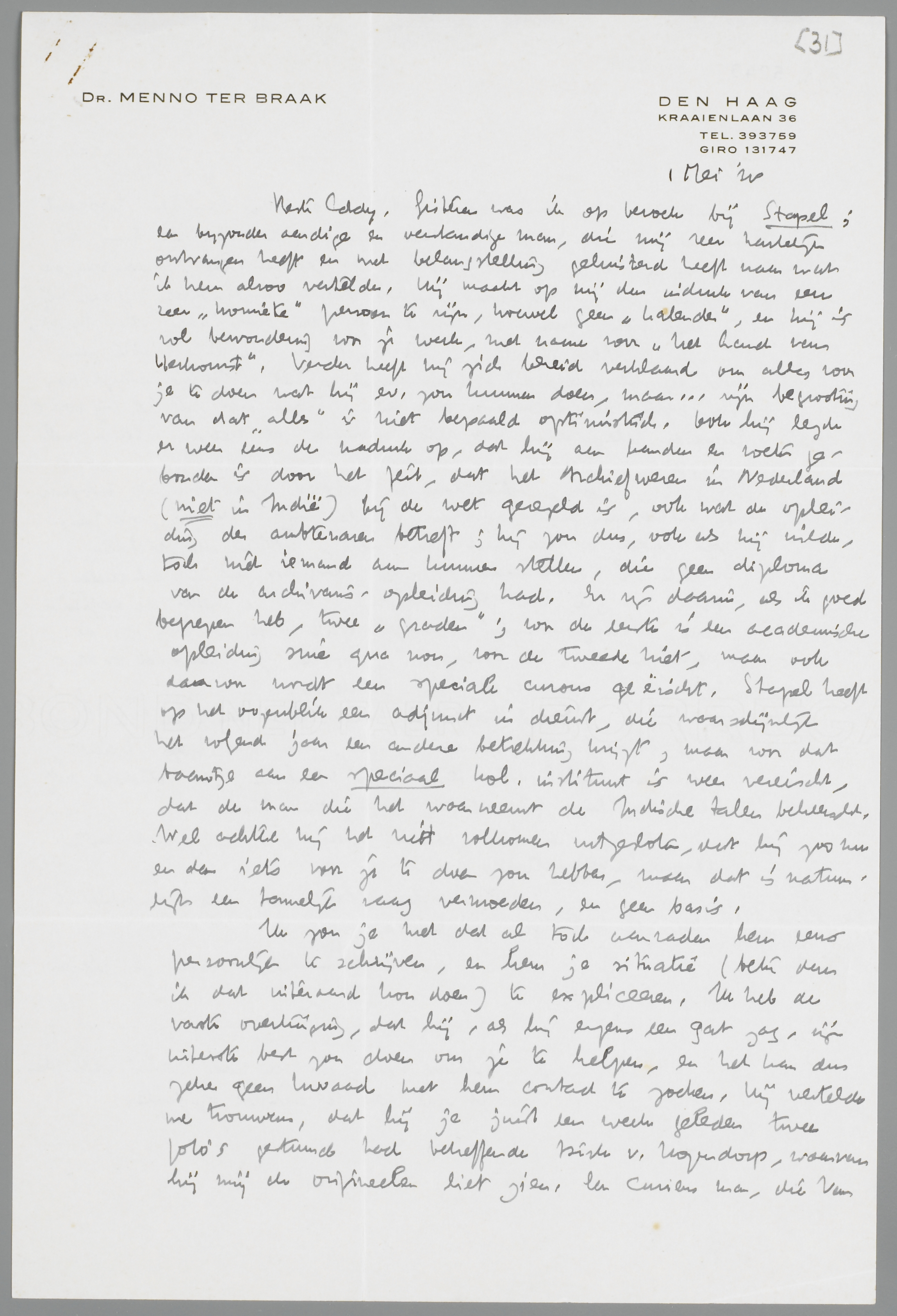 Gisteren was ik op bezoek bij Stapel; een bijzonder aardige en verstandige man, die mij zeer hartelijk ontvangen heeft en met belangstelling geluisterd heeft naar wat ik hem alzoo vertelde. Hij maakt op mij den indruk van een zeer ‘honnête’ persoon te zijn, hoewel geen ‘kalender’, en hij is vol bewondering voor je werk, met name voor Het Land van Herkomst. Verder heeft hij zich bereid verklaard om alles voor je te doen wat hij ev. zou kunnen doen, maar... zijn begrooting van dat ‘alles’ is niet bepaald optimistisch. Ook hij legde er weer eens de nadruk op, dat hij aan handen en voeten gebonden is door het feit, dat het Archiefwezen in Nederland (niet in Indië) bij de wet geregeld is, ook wat de opleiding der ambtenaren betreft; hij zou dus, ook als hij wilde, toch niet iemand aan kunnen stellen, die geen diploma van de archivaris-opleiding had. Er zijn daarin, als ik goed begrepen heb, twee ‘graden’; voor de eerste is een academische opleiding sine qua non, voor de tweede niet, maar ook daarvoor wordt een speciale cursus geëischt. Stapel heeft op het oogenblik een adjunct in dienst, die waarschijnlijk het volgend jaar een andere betrekking krijgt, maar voor dat baantje aan een speciaal kol. instituut is weer vereischt, dat de man die het waarneemt de Indische talen beheerscht. Wel achtte hij het niet volkomen uitgesloten, dat hij zoo nu en dan iets voor je te doen zou hebben, maar dat is natuurlijk een tamelijk vaag vermoeden, en geen basis.
