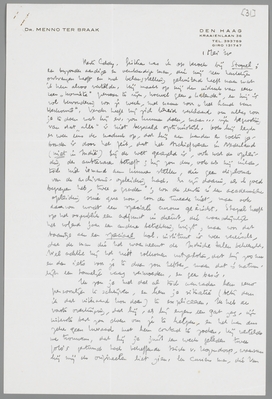 Ik zou je met dat al toch aanraden hem eens persoonlijk te schrijven, en hem je situatie (beter dan ik dat uiteraard kon doen) te expliceeren. Ik heb de vaste overtuiging, dat hij, als hij ergens een gat zag, zijn uiterste best zou doen om je te helpen, en het kan dus zeker geen kwaad met hem contact te zoeken. Hij vertelde me trouwens, dat hij je juist een week geleden twee foto's gestuurd had betreffende Dirk v. Hogendorp, waarvan hij mij de origineelen liet zien. Een curieus man, die Van Hogendorp, lijkt mij, naar wat hij me van hem en passant meedeelde. Hij heeft nog drie foto's (een van het huis bij Rio in zijn teg. toestand, een van de gedenksteen, en een van de omgeving bij ‘Nova Sion’, zooals die er nu uitziet), die hij je niet kon sturen, omdat hij er geen duplicaten van bezit.