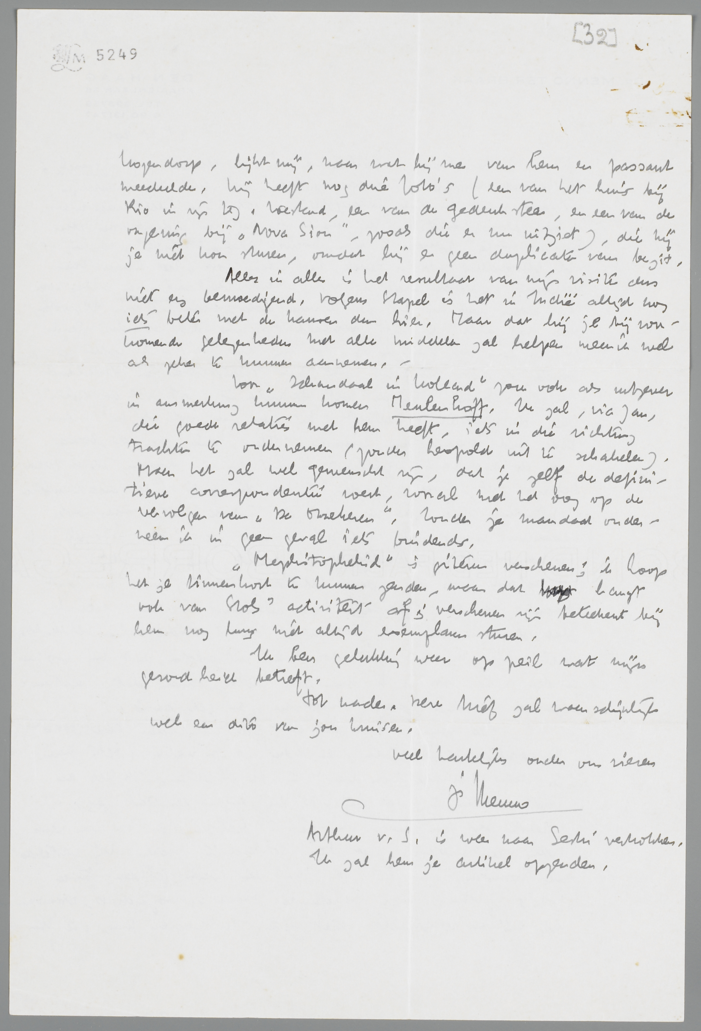 Voor Schandaal in Holland zou ook als uitgever in aanmerking kunnen komen Meulenhoff. Ik zal, via Jan, die goede relaties met hem heeft, iets in die richting trachten te ondernemen (zonder Leopold uit te schakelen). Maar het zal wel gewenscht zijn, dat je zelf de definitieve correspondentie voert, vooral met het oog op de vervolgen van De Onzekeren. Zonder je mandaat onderneem ik in geen geval iets bindends.