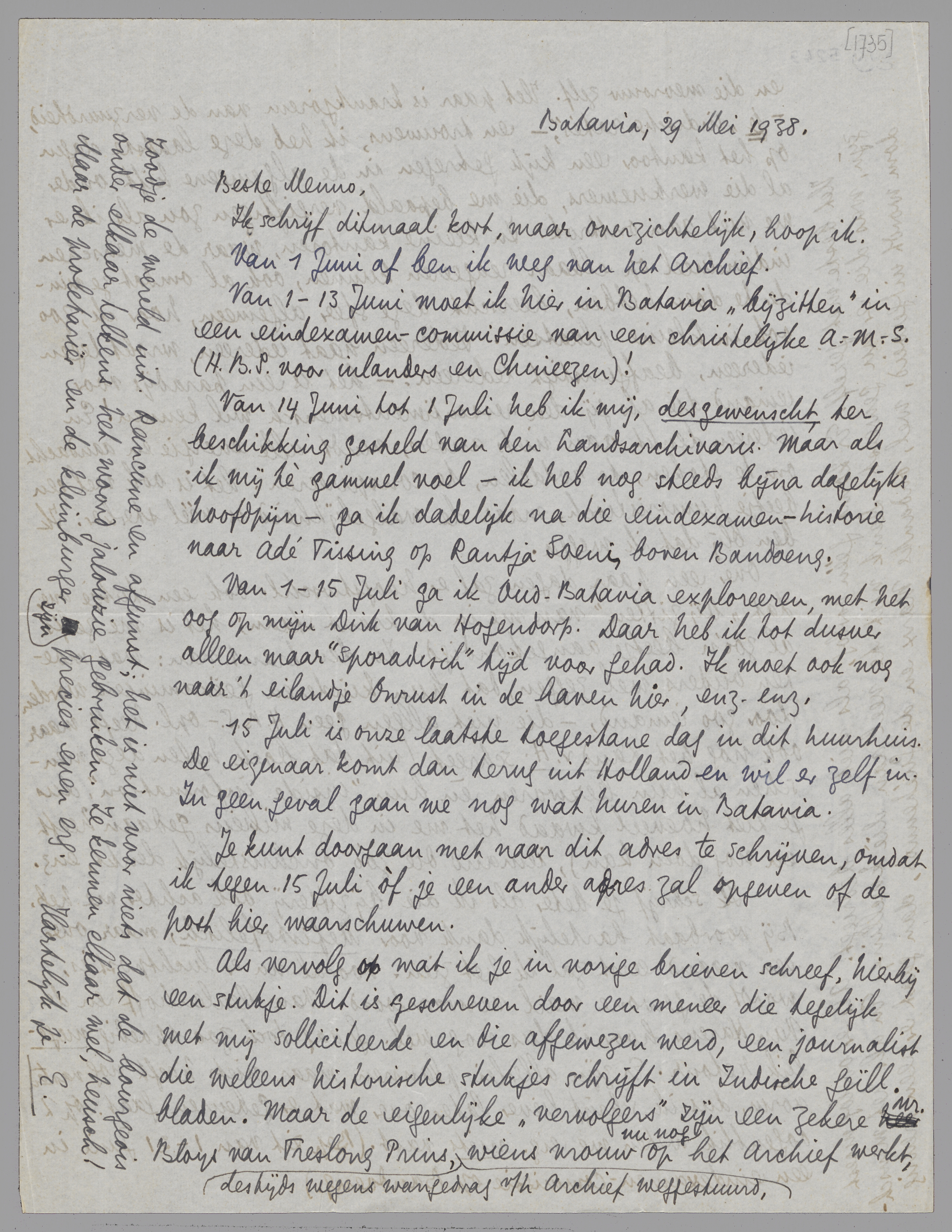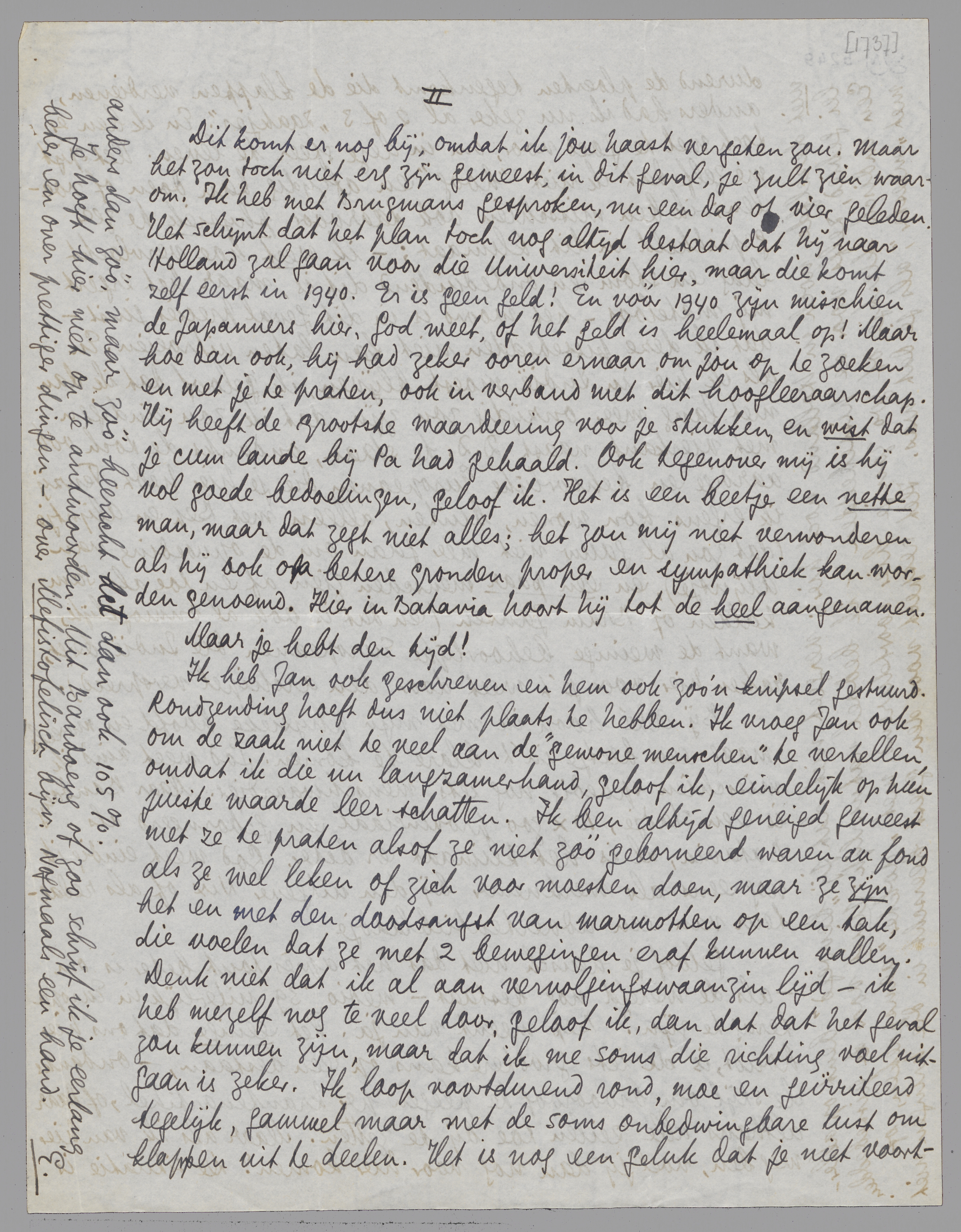 Dit komt er nog bij, omdat ik jou haast vergeten zou. Maar het zou toch niet erg zijn geweest, in dit geval, je zult zien waarom. Ik heb met Brugmans gesproken, nu een dag of vier geleden. Het schijnt dat het plan toch nog altijd bestaat dat hij naar Holland zal gaan voor die Universiteit hier, maar die komt zelf eerst in 1940. Er is geen geld! En vóór 1940 zijn misschien de Japanners hier, God weet, of het geld is heelemaal op! Maar hoe dan ook, hij had zeker ooren ernaar om jou op te zoeken en met je te praten, ook in verband met dit hoogleeraarschap. Hij heeft de grootste waardeering voor je stukken, en wist dat je cum laude bij Pa had gehaald. Ook tegenover mij is hij vol goede bedoelingen, geloof ik. Het is een beetje een nette man, maar dat zegt niet alles; het zou mij niet verwonderen als hij ook op betere gronden proper en sympathiek kan worden genoemd. Hier in Batavia hoort hij tot de heel aangenamen.