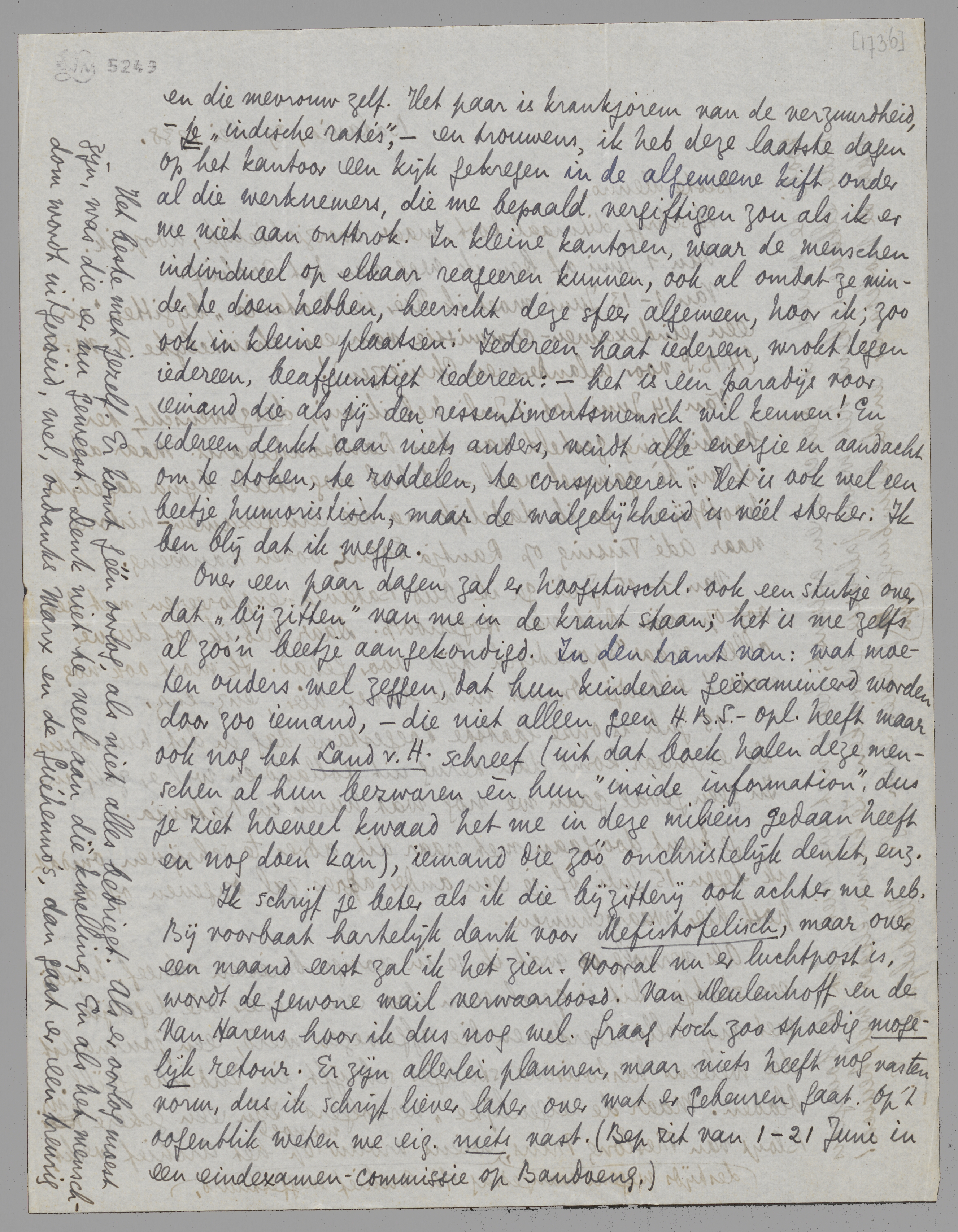 Als vervolg op wat ik je in vorige brieven schreef, hierbij een stukje. Dit is geschreven door een meneer die tegelijk met mij solliciteerde en die afgewezen werd, een journalist die weleens historische stukjes schrijft in Indische geïll. bladen. Maar de eigenlijke ‘vervolgers’ zijn een zekere Mr. Bloys van Treslong Prins, destijds wegens wangedrag v/h Archief weggestuurd, wiens vrouw nu nog op het archief werkt, en die mevrouw zelf. Het paar is krankjorem van de verzuurdheid, -je ‘indische ratés,’ - en trouwens, ik heb deze laatste dagen op het kantoor een kijk gekregen in de algemeene kift onder al die werknemers, die me bepaald vergiftigen zou als ik er me niet aan onttrok. In kleine kantoren, waar de menschen individueel op elkaar reageeren kunnen, ook al omdat ze minder te doen hebben, heerscht deze sfeer algemeen, hoor ik; zoo ook in kleine plaatsen. Iedereen haat iedereen, wrokt tegen iedereen, beafgunstigt iedereen: - het is een paradijs voor iemand die als jij den ressentimentsmensch wil kennen! En iedereen denkt aan niets anders, vindt alle energie en aandacht om te stoken, te roddelen, te conspireeren. Het is ook wel een beetje humoristisch, maar de walgelijkheid is véél sterker. Ik ben blij dat ik wegga.