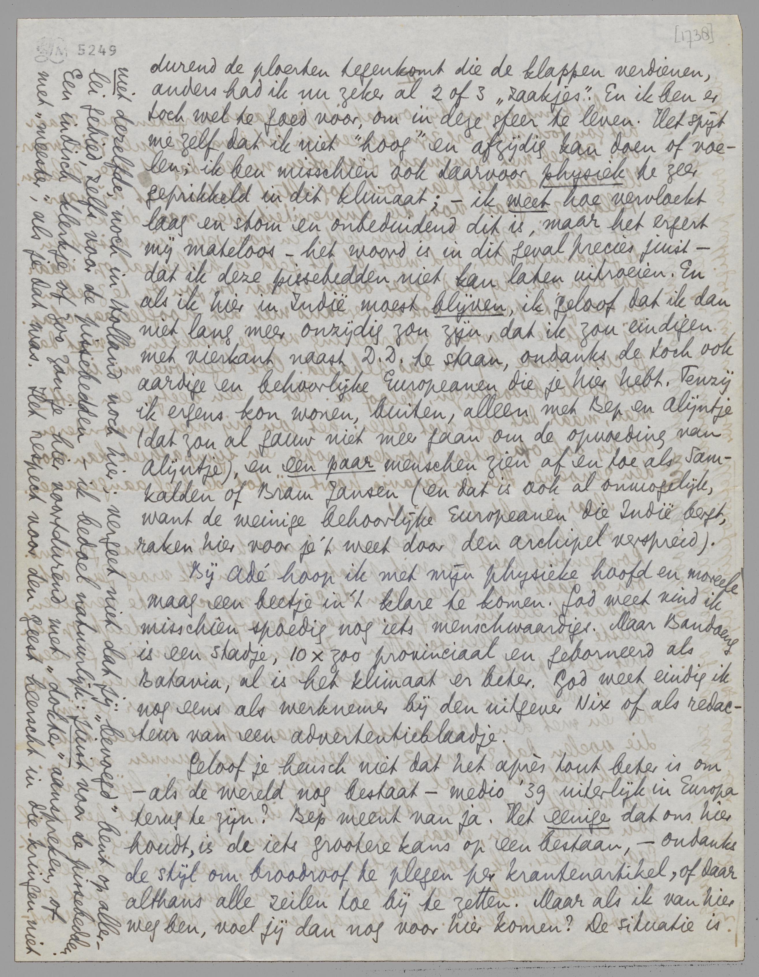 Geloof je heusch niet dat het après tout beter is om - als de wereld nog bestaat - medio '39 uiterlijk in Europa terug te zijn? Bep meent van ja. Het eenige dat ons hier houdt, is de iets grootere kans op een bestaan, - ondanks de stijl om broodroof te plegen per krantenartikel, of daar althans alle zeilen toe bij te zetten. Maar als ik van hier weg ben, voel jij dan nog voor hier komen? De situatie is niet dezelfde, noch in Holland noch hier; vergeet niet dat jij ‘bevoegd’ bent op allerlei gebied, zelfs voor de pissebedden - ik bedoel natuurlijk: juist voor de pissebedden. Een indisch klerkje of zoo zou je hier voortdurend met ‘dokter’ aanspreken, of met ‘meester’, als je dat was. Het respect voor den geest heerscht in die kringen niet anders dan zóó, maar zóó heerscht het dan ook 105%.