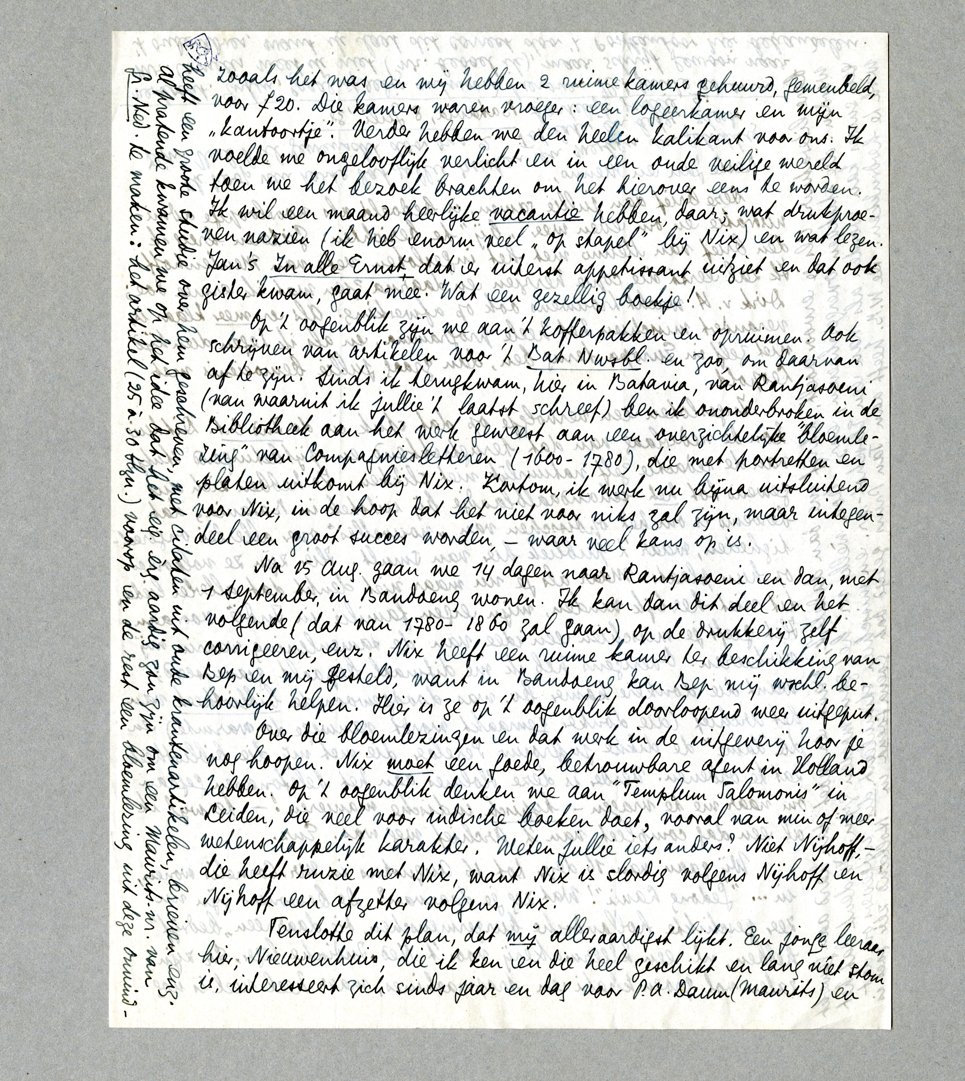 Op 't oogenblik zijn we aan 't kofferpakken en opruimen. Ook schrijven van artikelen voor 't Bat. Nwsbl. en zoo, om daarvan af te zijn. Sinds ik terugkwam, hier in Batavia, van Rantjasoeni (van waaruit ik jullie 't laatst schreef) ben ik ononderbroken in de Bibliotheek aan het werk geweest aan een overzichtelijke ‘bloemlezing’ van Compagniesletteren (1600-1780), die met portretten en platen uitkomt bij Nix. Kortom, ik werk nu bijna uitsluitend voor Nix, in de hoop dat het niet voor niks zal zijn, maar integendeel een groot succes worden, - waar veel kans op is.