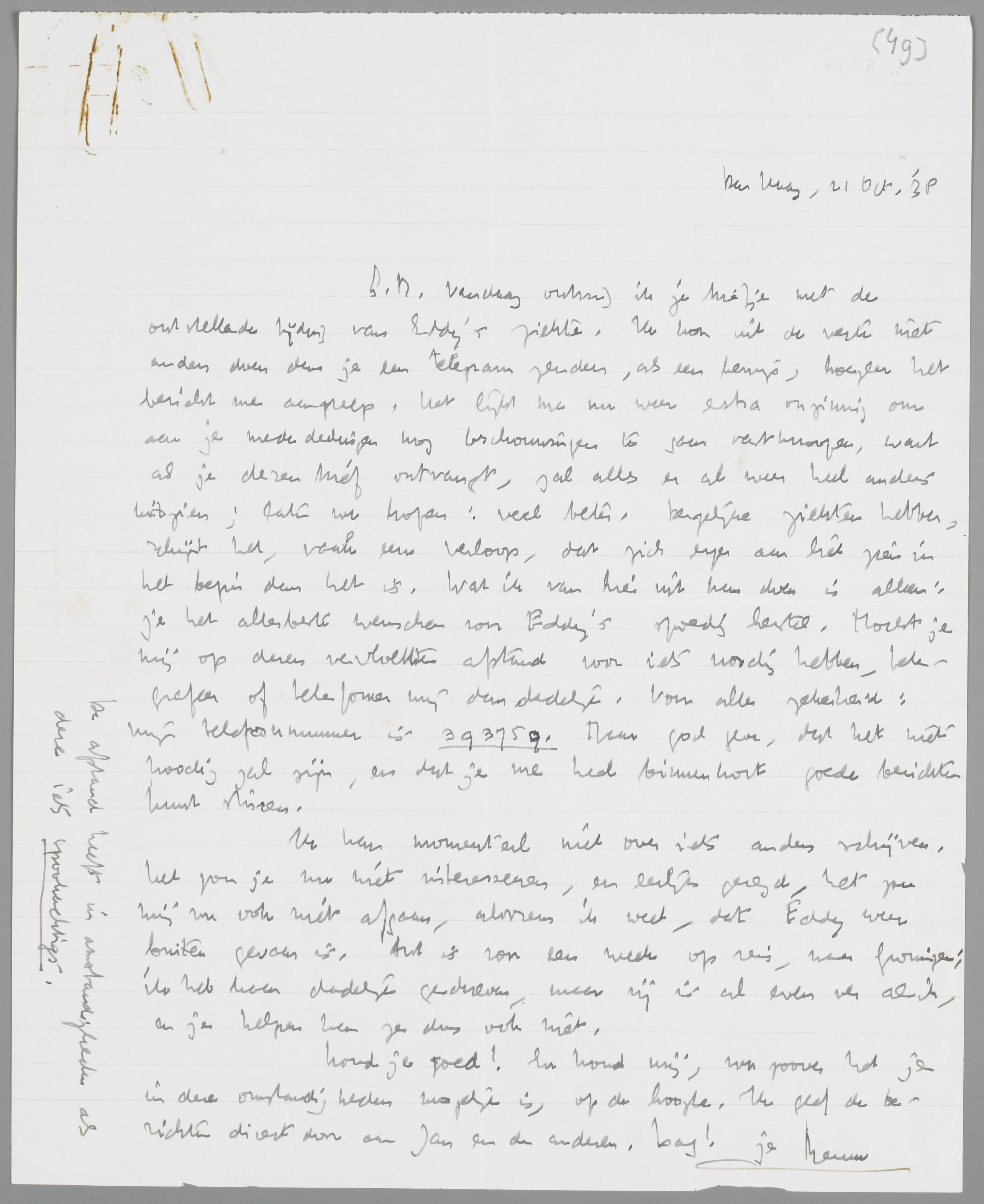 Vandaag ontving ik je briefje met de ontstellende tijding van Eddy's ziekte. Ik kon uit de verte niet anders doen dan je een telegram zenden, als een bewijs, hoezeer het bericht me aangreep. Het lijkt me nu weer extra onzinnig om aan je mededeelingen nog beschouwingen te gaan vastknoopen, want als je dezen brief ontvangt, zal alles er al weer heel anders uitzien; laten we hopen: veel beter. Dergelijke ziekten hebben, schijnt het, vaak een verloop, dat zich erger aan liet zien in het begin dan het is. Wat ik van hier uit kan doen is alleen: je het allerbeste wenschen voor Eddy's spoedig herstel. Mocht je mij op dezen vervloekten afstand voor iets noodig hebben, telegrafeer of telefoneer mij dan dadelijk. Voor alle zekerheid: mijn telefoonnummer is 393759. Maar god geve, dat het niet noodig zal zijn, en dat je me heel binnenkort goede berichten kunt sturen.