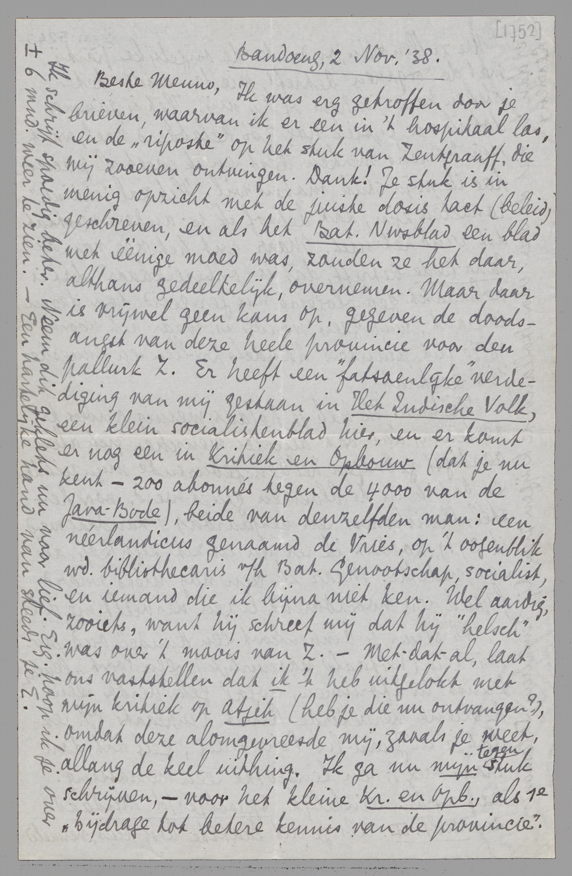 Ik was erg getroffen door je brieven, waarvan ik er een in 't hospitaal las, en de ‘riposte’ op het stuk van Zentgraaff, die wij zooeven ontvingen. Dank! Je stuk is in menig opzicht met de juiste dosis tact (beleid) geschreven, en als het Bat. Nwsblad een blad met éénige moed was, zouden ze het daar, althans gedeeltelijk, overnemen. Maar daar is vrijwel geen kans op, gegeven de doodsangst van deze heele provincie voor den pallurk Z. Er heeft een ‘fatsoenlijke’ verdediging van mij gestaan in Het Indische Volk, een klein socialistenblad hier, en er komt er nog een in Kritiek en Opbouw (dat je nu kent - 200 abonnés tegen de 4000 van de Java-Bode), beide van denzelfden man: een néerlandicus genaamd de Vries, op 't oogenblik wd. bibliothecaris v/h Bat. Genootschap, socialist, en iemand die ik bijna niet ken. Wel aardig, zooiets, want hij schreef mij dat hij ‘helsch’ was over 't moois van Z. - Met-dat-al, laat ons vaststellen dat ik 't heb uitgelokt met mijn kritiek op Atjeh (heb je die nu ontvangen?), omdat deze alomgevreesde mij, zooals je weet, allang de keel uithing. Ik ga nu mijn tegenstuk schrijven, - voor het kleine Kr. en Opb., als 1e ‘bijdrage tot betere kennis van de provincie’.