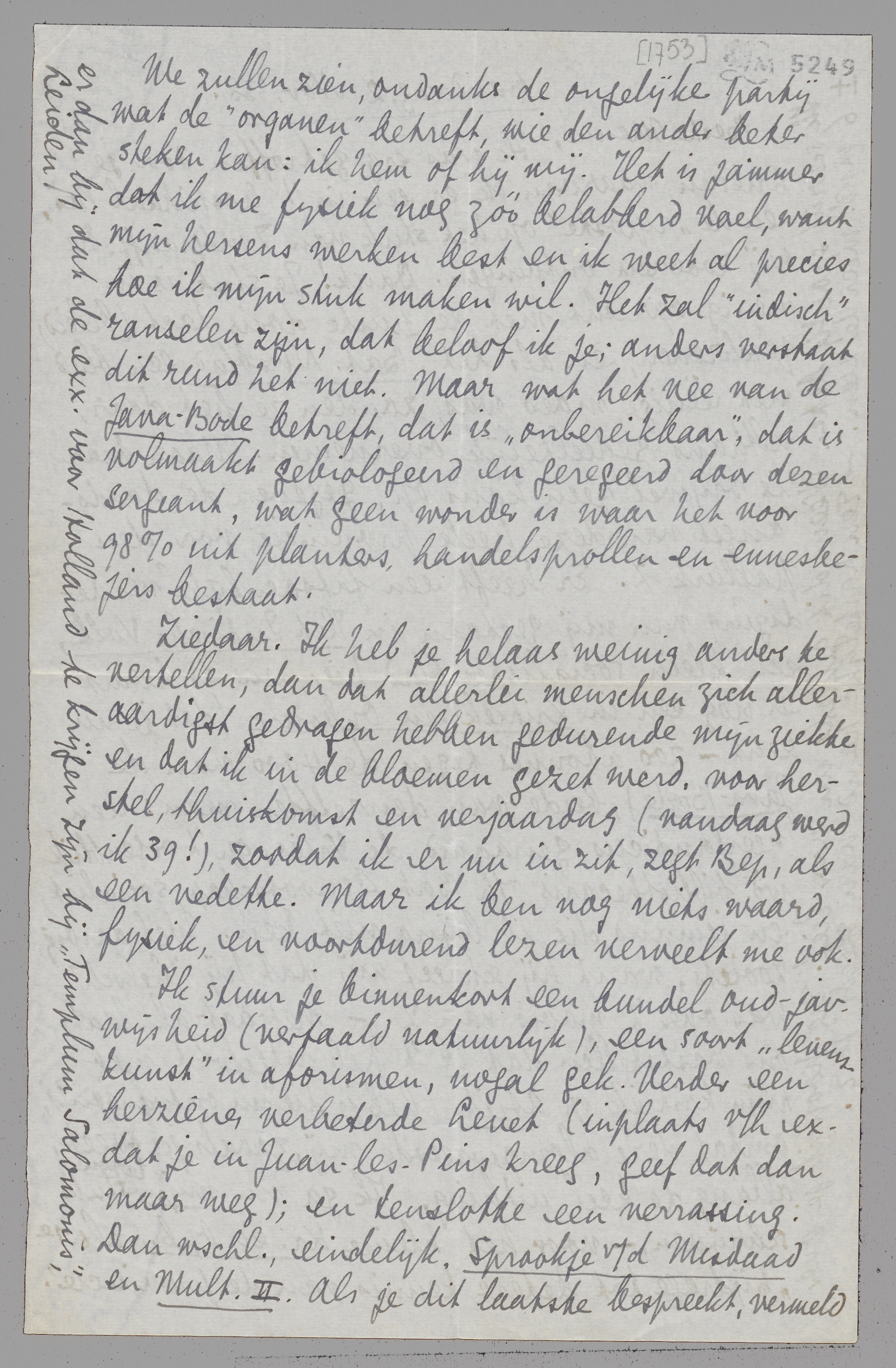 We zullen zien, ondanks de ongelijke partij wat de ‘organen’ betreft, wie den ander beter steken kan: ik hem of hij mij. Het is jammer dat ik me fysiek nog zóó belabberd voel, want mijn hersens werken best en ik weet al precies hoe ik mijn stuk maken wil. Het zal ‘indisch’ ranselen zijn, dat beloof ik je; anders verstaat dit rund het niet. Maar wat het vee van de Java-Bode betreft, dat is ‘onbereikbaar’, dat is volmaakt gebiologeerd en geregeerd door dezen sergeant, wat geen wonder is waar het voor 98% uit planters, handelsprollen en ennesbejers bestaat.