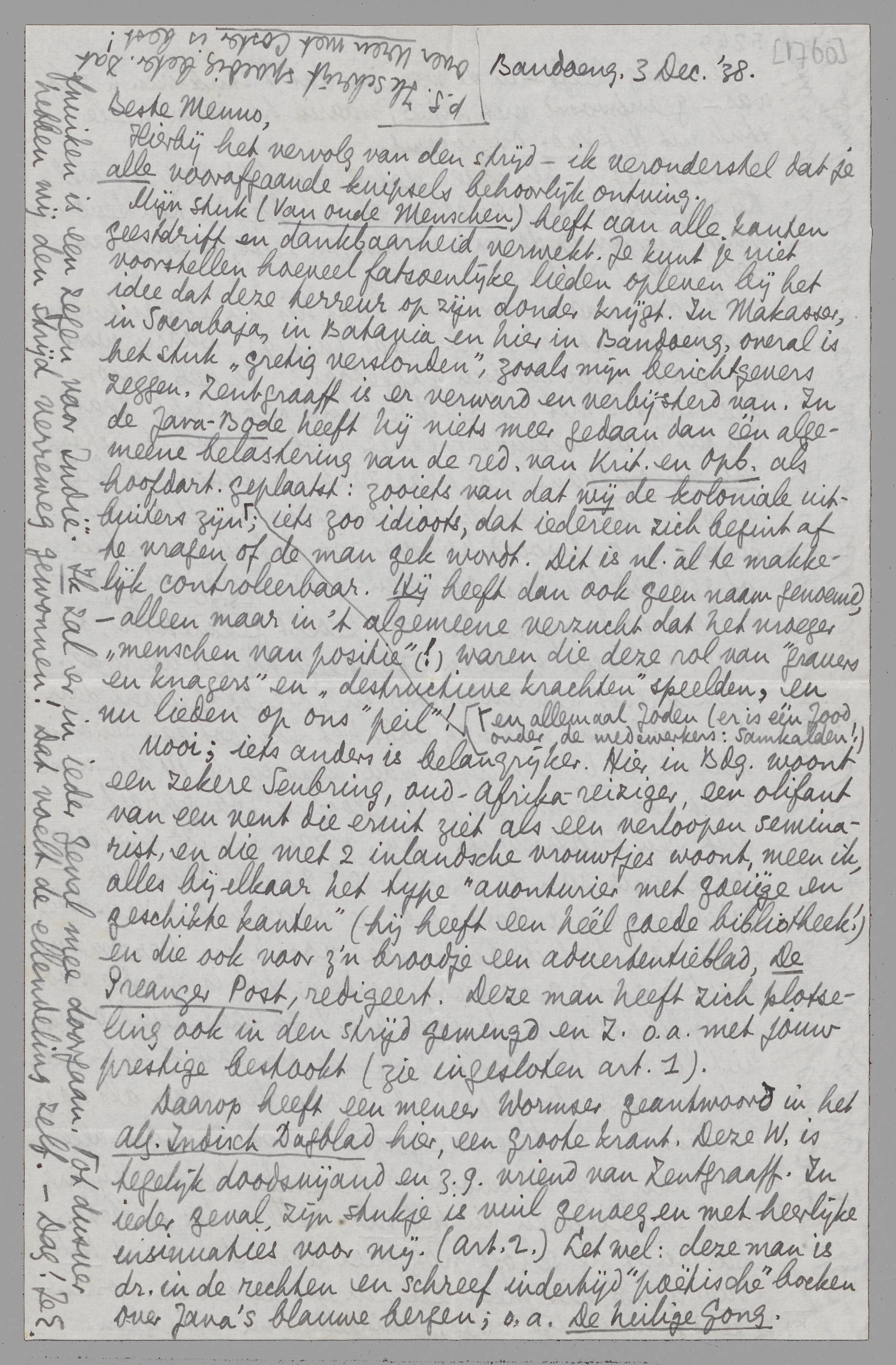 Mijn stuk (Van oude Menschen) heeft aan alle kanten geestdrift en dankbaarheid verwekt. Je kunt je niet voorstellen hoeveel fatsoenlijke lieden opleven bij het idee dat deze terreur op zijn donder krijgt. In Makasser, in Soerabaja, in Batavia en hier in Bandoeng, overal is het stuk ‘gretig verslonden’, zooals mijn berichtgevers zeggen. Zentgraaff is er verward en verbijsterd van. In de Java-Bode heeft hij niets meer gedaan dan één algemeene belastering van de red. van Krit. en Opb. als hoofdart. geplaatst: zooiets van dat wij de koloniale uitbuiters zijn en allemaal Joden (er is één Jood onder de medewerkers: Samkalden!); iets zoo idioots, dat iedereen zich begint af te vragen of de man gek wordt. Dit is nl. àl te makkelijk controleerbaar. Hij heeft dan ook geen naam genoemd, - alleen maar in 't algemeene verzucht dat het vroeger ‘menschen van positie’ (!) waren die deze rol van ‘gravers en knagers’ en ‘destructieve krachten’ speelden, en nu lieden op ons ‘peil’!