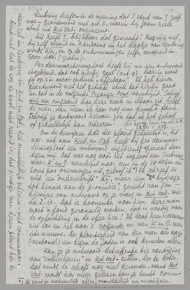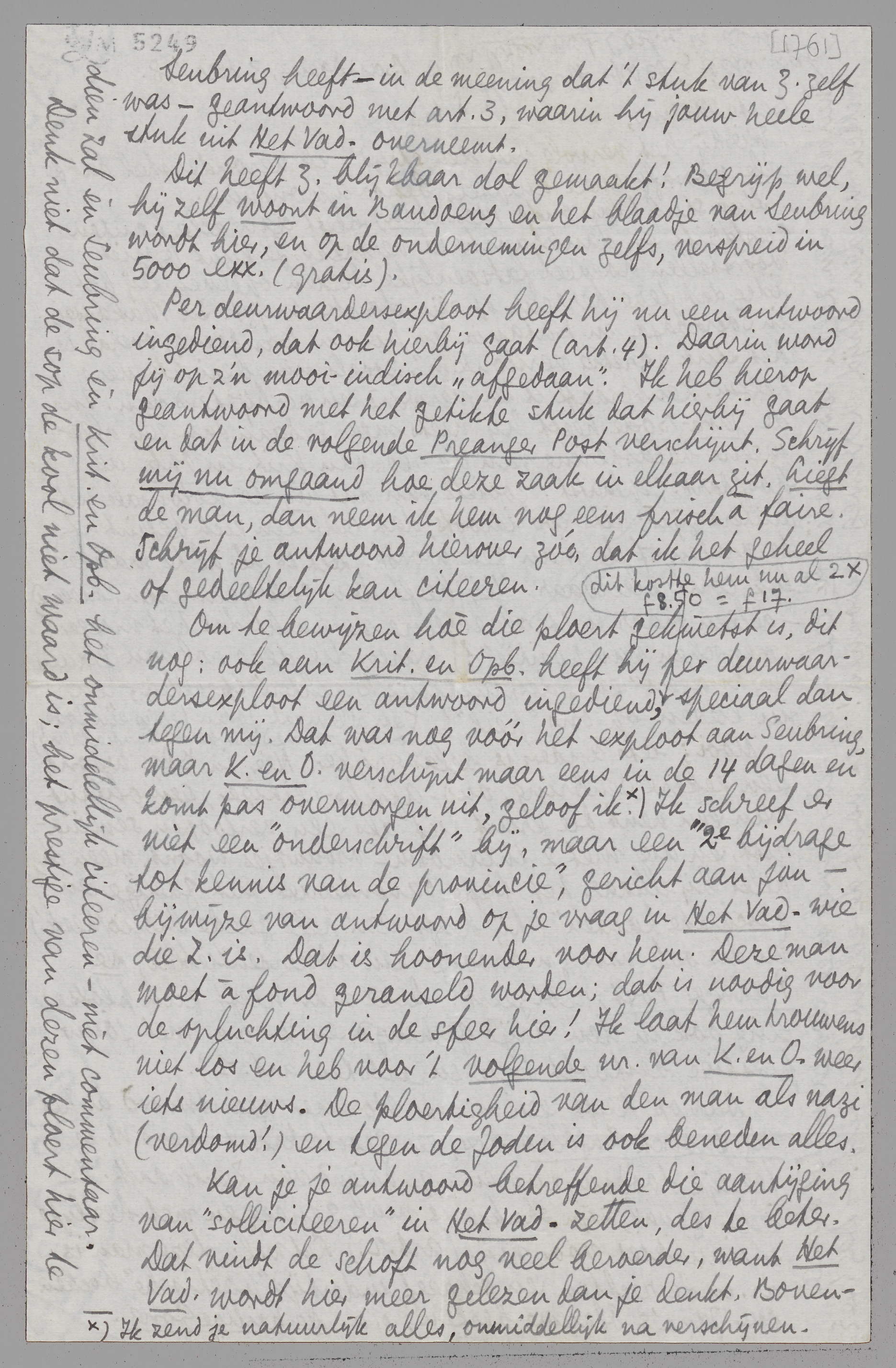 Om te bewijzen hoè die ploert gekwetst is, dit nog: ook aan Krit. en Opb. heeft hij per deurwaardersexploot een antwoord ingediend [dit kostte hem nu al 2 × ƒ8.50 = ƒ17.] speciaal dan tegen mij. Dat was nog vóór het exploot aan Seubring, maar K. en O. verschijnt maar eens in de 14 dagen en komt pas overmorgen uit, geloof ik. [Ik zend je natuurlijk alles, onmiddellijk na verschijnen.] Ik schreef er niet een ‘onderschrift’ bij, maar een ‘2e bijdrage tot kennis van de provincie’, gericht aan jou - bijwijze van antwoord op je vraag in Het Vad. wie die Z. is. Dat is hoonender voor hem. Deze man moet à fond geranseld worden; dat is noodig voor de opluchting in de sfeer hier! Ik laat hem trouwens niet los en heb voor 't volgende nr. van K. en O. weer iets nieuws. De ploertigheid van den man als nazi (verdomd!) en tegen de Joden is ook beneden alles.