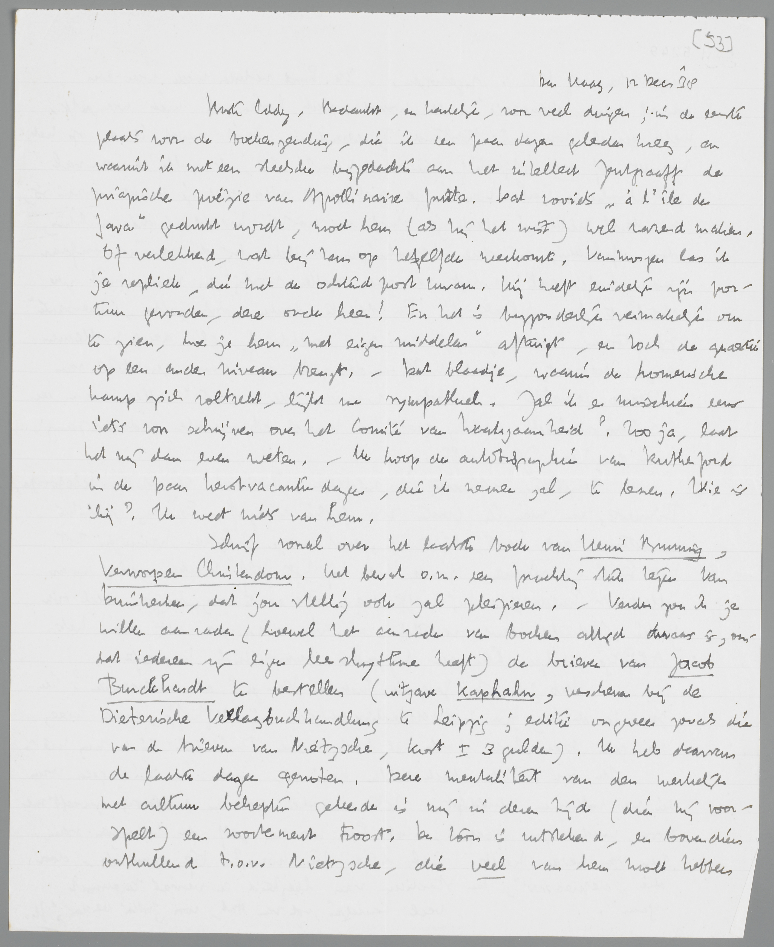 Bedankt, en hartelijk, voor veel dingen; in de eerste plaats voor de boekenzending, die ik een paar dagen geleden kreeg, en waaruit ik met een steelsche bijgedachte aan het intellect Zentgraaff de priapische poëzie van Apollinaire putte. Dat zooiets ‘à l'île de Java’ gedrukt wordt, moet hem (als hij het wist) wel razend maken. Of verlekkerd, wat bij hem op hetzelfde neerkomt. Vanmorgen las ik je repliek, die met de ochtendpost kwam. Hij heeft eindelijk zijn portuur gevonden, deze oude heer! En het is bijzonderlijk vermakelijk om te zien, hoe je hem ‘met eigen middelen’ aftuigt, en toch de quaestie op een ander niveau brengt. - Dat blaadje, waarin de homerische kamp zich voltrekt, lijkt me sympathiek. Zal ik er misschien eens iets voor schrijven over het Comité van Waakzaamheid? Zoo ja, laat het mij dan even weten. - Ik hoop de autobiographie van Rutherford in de paar kerstvacantiedagen, die ik nemen zal, te lezen. Wie is hij? Ik weet niets van hem.