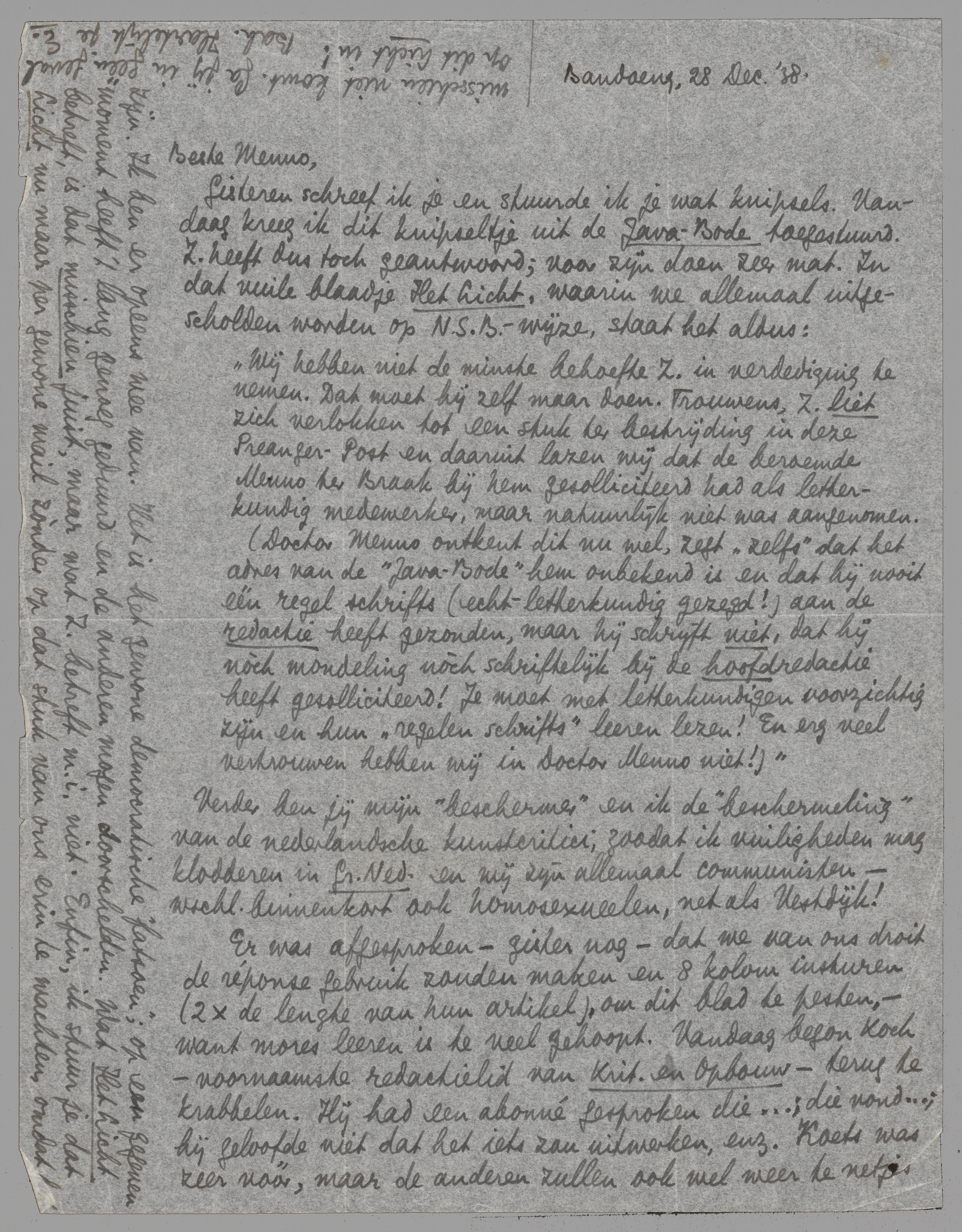 Gisteren schreef ik je en stuurde ik je wat knipsels. Vandaag kreeg ik dit knipseltje uit de Java-Bode toegestuurd. Z. heeft dus toch geantwoord; voor zijn doen zeer mat. In dat vuile blaadje Het Licht, waarin we allemaal uitgescholden worden op N.S.B.-wijze, staat het aldus: