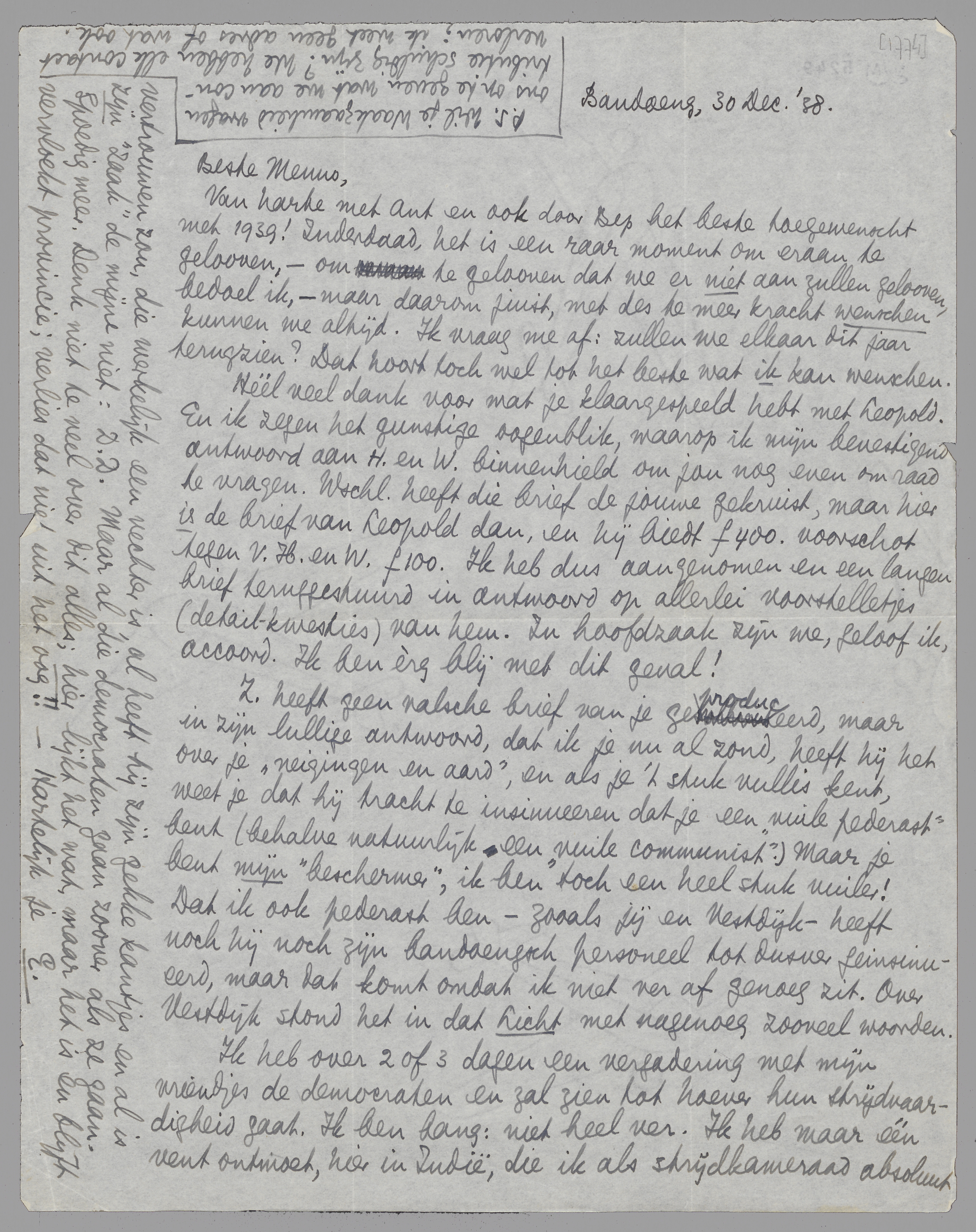 Van harte met Ant en ook door Bep het beste toegewenscht met 1939! Inderdaad, het is een raar moment om eraan te gelooven, - om te gelooven dat we er niet aan zullen gelooven, bedoel ik, - maar daarom juist, met des te meer kracht wenschen kunnen we altijd. Ik vraag me af: zullen we elkaar dit jaar terugzien? Dat hoort toch wel tot het beste wat ik kan wenschen.
