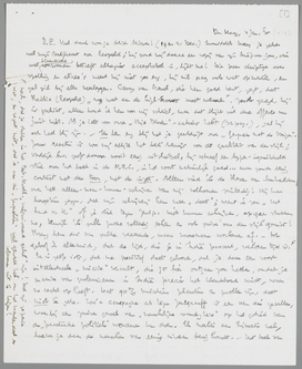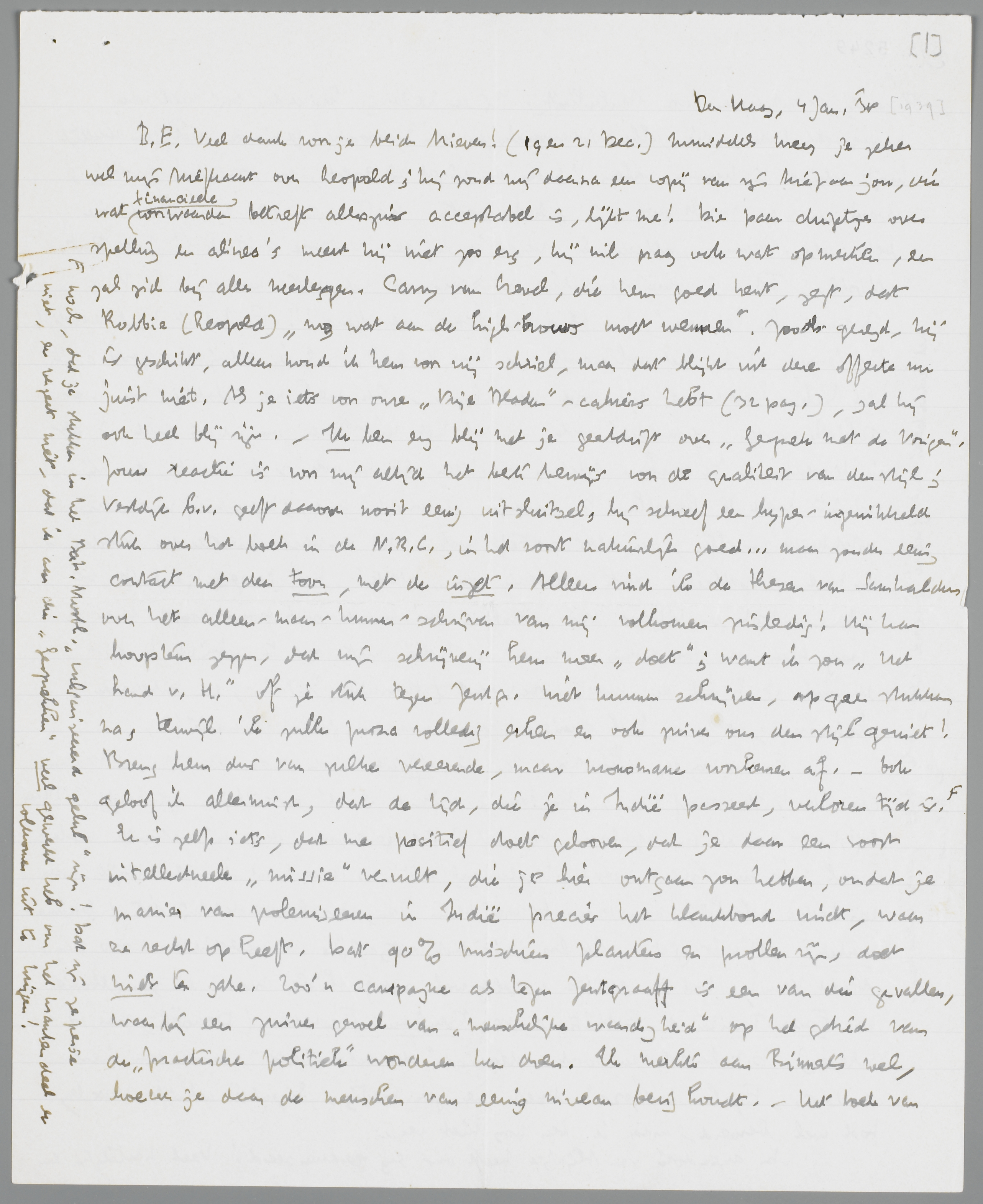 Veel dank voor je beide brieven! (19 en 21 Dec.) Inmiddels kreeg je zeker wel mijn briefkaart over Leopold; hij zond mij daarna een copij van zijn brief aan jou, die wat financieele voorwaarden betreft alleszins acceptabel is, lijkt me! Die paar dingetjes over spelling en alinea's meent hij niet zoo erg, hij wil graag ook wat opmerken, en zal zich bij alles neerleggen. Carry van Crevel, die hem goed kent, zegt, dat Robbie (Leopold) ‘nog wat aan de high-brows moet wennen’. Zooals gezegd, hij is geschikt, alleen houd ik hem voor vrij schriel, maar dat blijkt uit deze offerte nu juist niet. Als je iets voor onze Vrije Bladen-cahiers hebt (32 pag.), zal hij ook heel blij zijn.