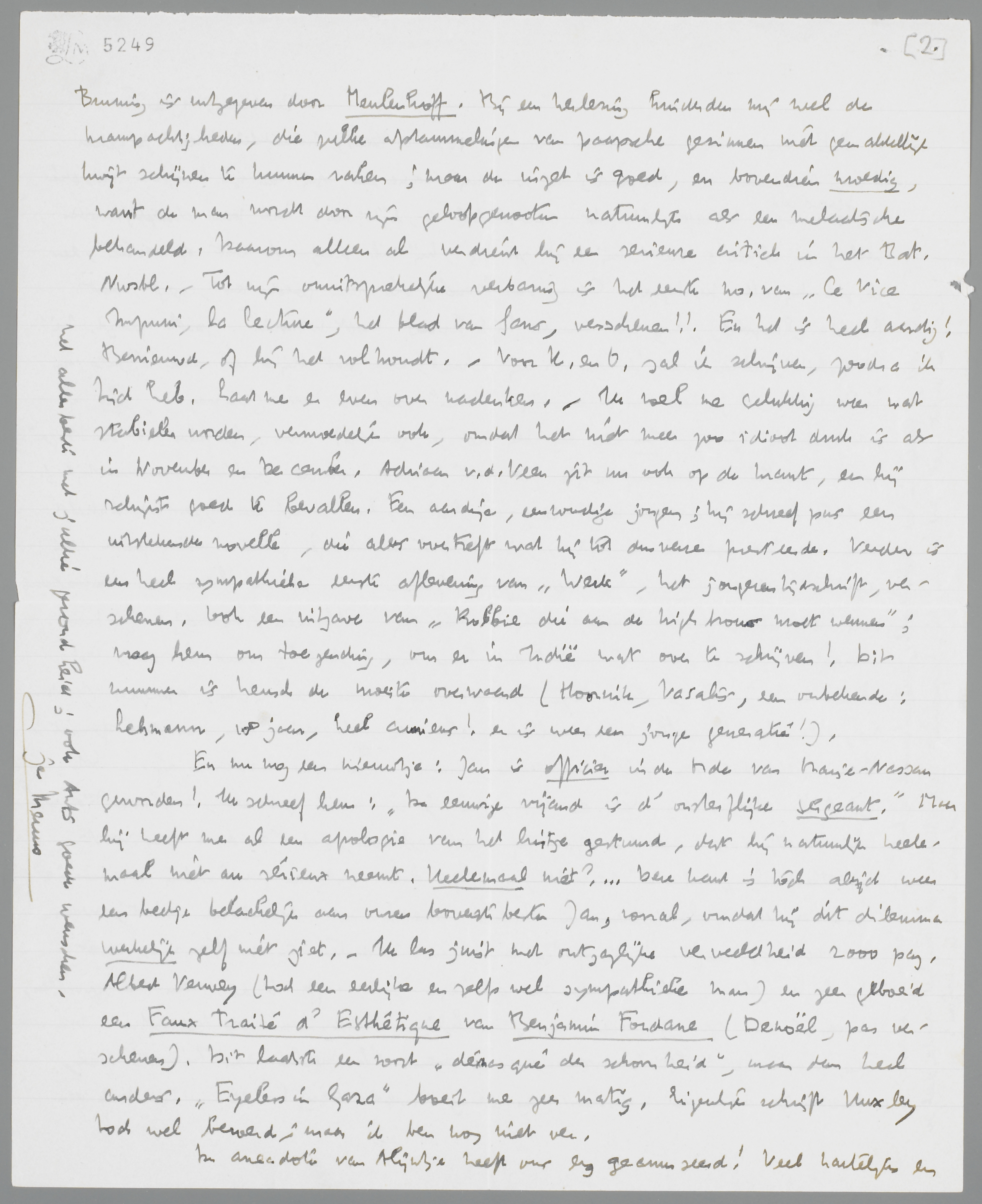 En nu nog een nieuwtje: Jan is officier in de Orde van Oranje-Nassau geworden! Ik schreef hem: ‘de eeuwige vijand is d'onsterflijke sergeant.’ Maar hij heeft me al een apologie van het lintje gestuurd, dat hij natuurlijk heelemaal niet au sérieux neemt. Heelemaal niet?... Deze kant is toch altijd weer een beetje belachelijk aan onzen bovenstebesten Jan, vooral, omdat hij dit dilemma werkelijk zelf niet ziet. - Ik las juist met ontzaglijke verveeldheid 2000 pag. Albert Verwey (toch een eerlijke en zelfs wel sympathieke man) en zeer geboeid een Faux Traité d'Esthétique van Benjamin Fondane (Denoël, pas verschenen). Dit laatste een soort ‘démasqué der schoonheid’, maar dan heel anders. Eyeless in Gaza boeit me zeer matig. Eigenlijk schrijft Huxley toch wel beroerd; maar ik ben nog niet ver.
