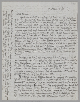 Ik ‘lig’ op het oogenblik bij een verpleegster aan den Lembangweg om op te knappen. Ik moest rust nemen van den dokter, die mij anders met allerlei ergs bedreigde. Over 10 dagen hoop ik zoo ver te zijn, dat ik weer met mijn 2e deel ind. letteren voortkan. Met 1 Juli hebben we ons huis aan de Wajanglaan opgezegd; schrijf me p/a uitgever A.C. Nix, Landraadweg 3, Bandoeng, dat is het veiligst. We kijken nu de booten na en hopen in Augustus weg te kunnen. Daarover nader.