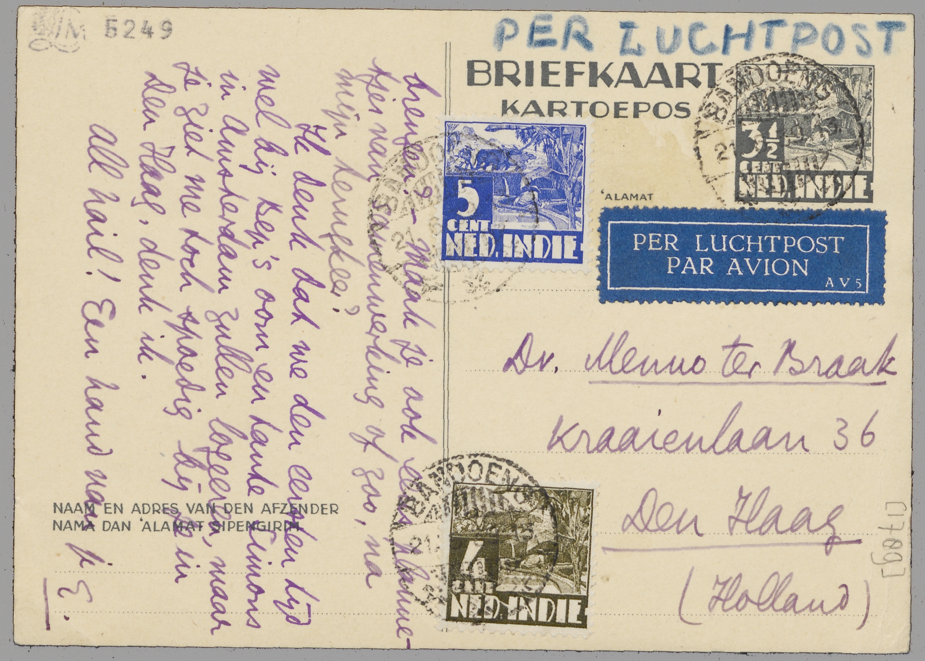 Nu positief bericht onzerzijds. Als er geen oorlog, ziekte of zooiets catastrofaals tusschen komt, vertrekken wij 12 Aug. op het vrachtschip Stentor (6 passagiers!), uit Batavia. Aankomst: ± 12 Sept. in Amsterdam.