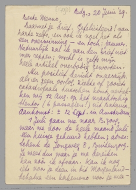 1 Juli gaan we naar B. zorg, waar we voor de heele maand Juli een huisje gehuurd hebben; adres: Schenk de Jongweg 8, Buitenzorg. Je weet dus waar je me bereiken kan vóór ik afvaar. Kan ik nog iets voor je doen in dit Morgenland - behalve een kakemono voor je meebrengen? - Maak je ook eens plannetjes van samenwerking of zoo, na mijn terugkeer?
