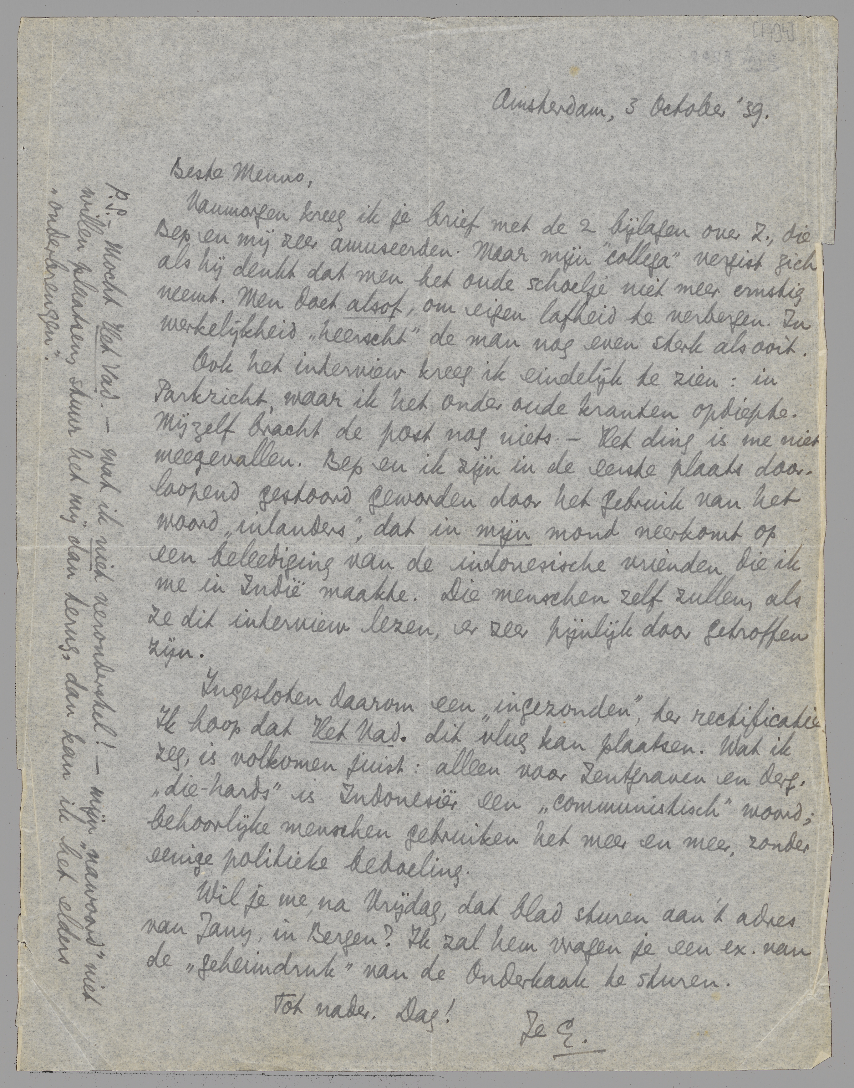Ook het interview kreeg ik eindelijk te zien: in Parkzicht, waar ik het onder oude kranten opdiepte. Mijzelf bracht de post nog niets. - Het ding is me niet meegevallen. Bep en ik zijn in de eerste plaats doorloopend gestoord geworden door het gebruik van het woord ‘inlanders’, dat in mijn mond neerkomt op een beleediging van de indonesische vrienden die ik me in Indië maakte. Die menschen zelf zullen, als ze dit interview lezen, er zeer pijnlijk door getroffen zijn.
