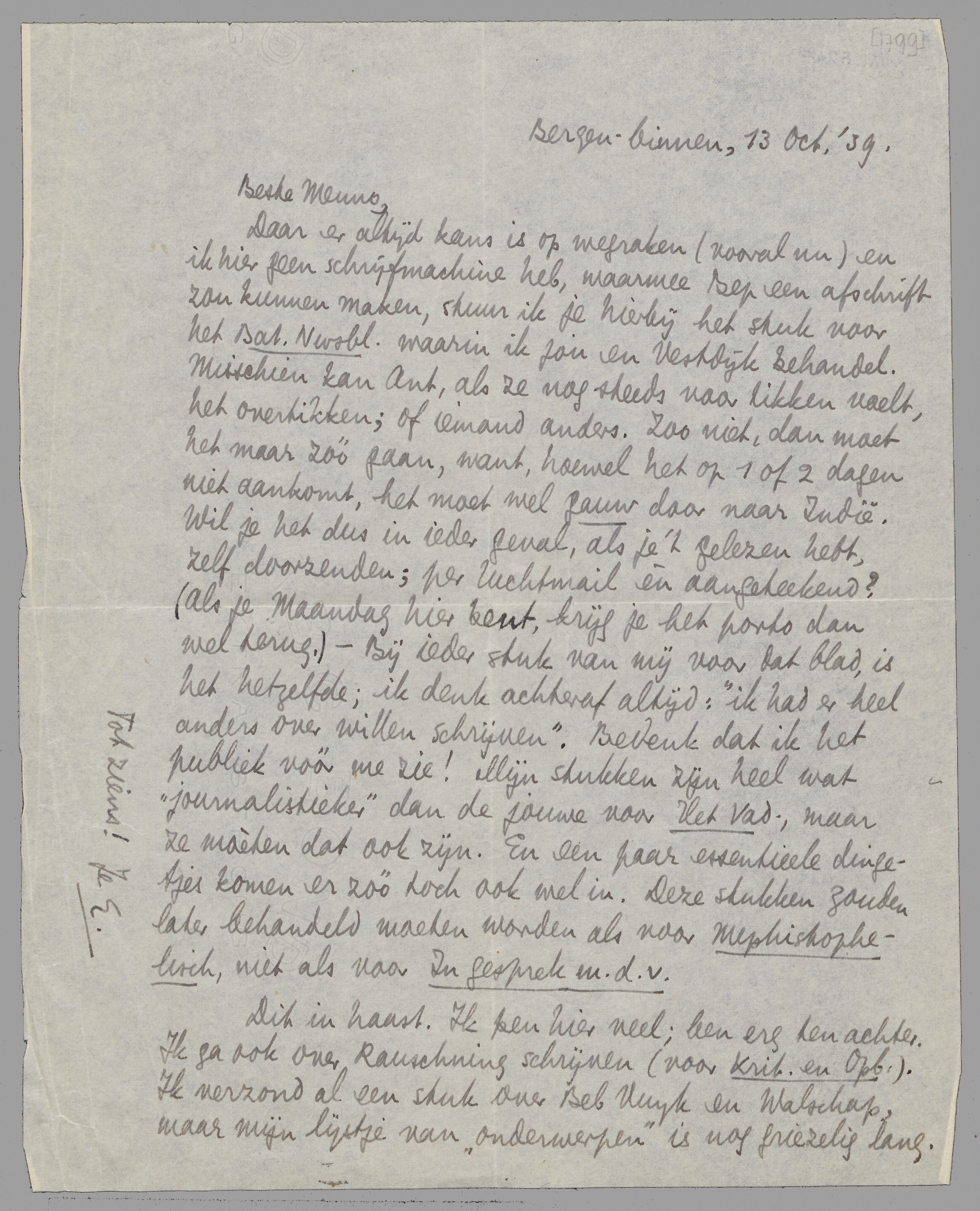 Daar er altijd kans is op wegraken (vooral nu) en ik hier geen schrijfmachine heb, waarmee Bep een afschrift zou kunnen maken, stuur ik je hierbij het stuk voor het Bat. Nwsbl. waarin ik jou en Vestdijk behandel. Misschien kan Ant, als ze nog steeds voor tikken voelt, het overtikken; of iemand anders. Zoo niet, dan moet het maar zóó gaan, want, hoewel het op 1 of 2 dagen niet aankomt, het moet wel gauw door naar Indië. Wil je het dus in ieder geval, als je 't gelezen hebt, zelf doorzenden; per luchtmail èn aangeteekend? (Als je Maandag hier bent, krijg je het porto dan wel terug.) - Bij ieder stuk van mij voor dat blad, is het hetzelfde; ik denk achteraf altijd: ‘ik had er heel anders over willen schrijven’. Bedenk dat ik het publiek vóór me zie! Mijn stukken zijn heel wat ‘journalistieker’ dan de jouwe voor Het Vad., maar ze moèten dat ook zijn. En een paar essentieele dingetjes komen er zóó toch ook wel in. Deze stukken zouden later behandeld moeten worden als voor Mephistophelisch, niet als voor In gesprek m.d.v.