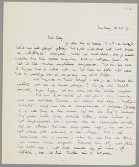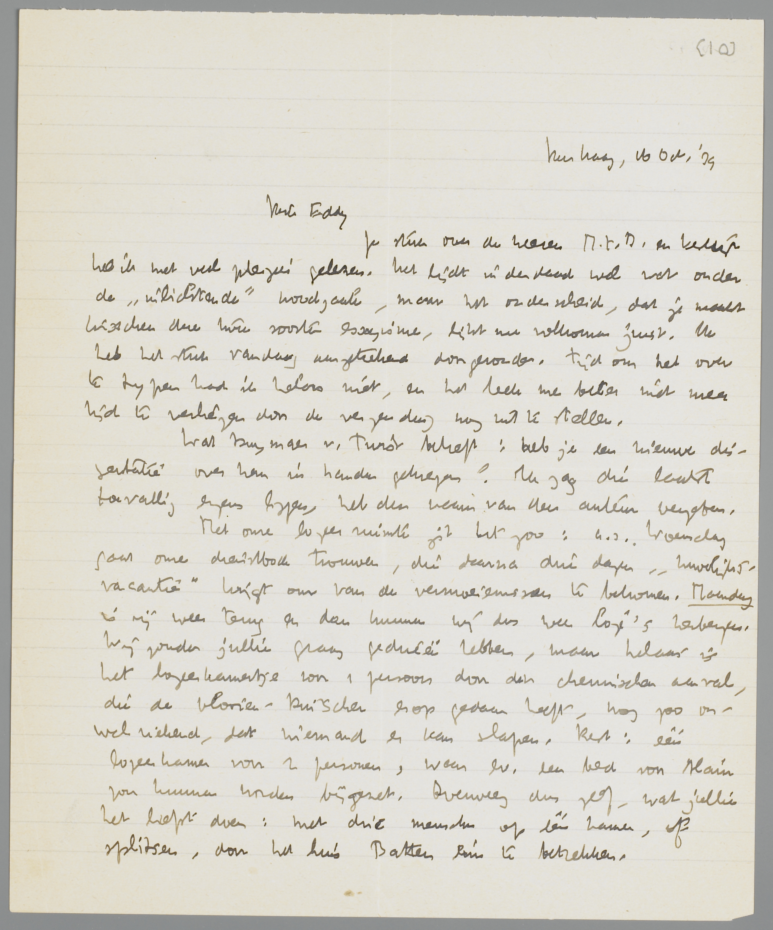 Als ik tijd heb, ga ik vanmiddag even naar de openingsrede van Romein in Amsterdam, maar dat zal zoo snel gaan, dat ik wel geen gelegenheid zal hebben je op te bellen voor een afspraak. Ik hoop voor a.s. Zondag over Schandaal in Holland te schrijven. In haast. Laat mij gauw weten, hoe jullie plannen zijn voor de logeer-organisatie.