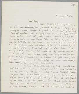 Zooeven je briefkaart. Het spijt ons erg, dat er weer een verhindering was; ditmaal een afspraak op Zondagmiddag en -avond, waaraan ik gansch niet meer gedacht heb, toen Bep mij opbelde. Maar als jullie daar nu nog een tijdje blijven, komen we toch heusch wel, hetzij volgend week-end, hetzij een dag in de week. - Oom Simons belde mij keurig op tijd op. Ik had de portretten der Van Harens in mijn hoofd, maar wist absoluut niet, waar ik ze gezien kon hebben. Willem is inderdaad typisch een ‘schaapskop’, Onno heeft wel een pienter hoofd. Ik stuur je mijn artikel Maandag; het beviel mij bij overlezen van de proef wel. Ik kreeg ook een proef van Vestdijk over het boek (in de N.R.C.; vanavond?) in handen; je zult merken, dat hij door den toon van zijn beoordeeling een nogal stoutmoedige frontbepaling in mijn stuk waarmaakt.