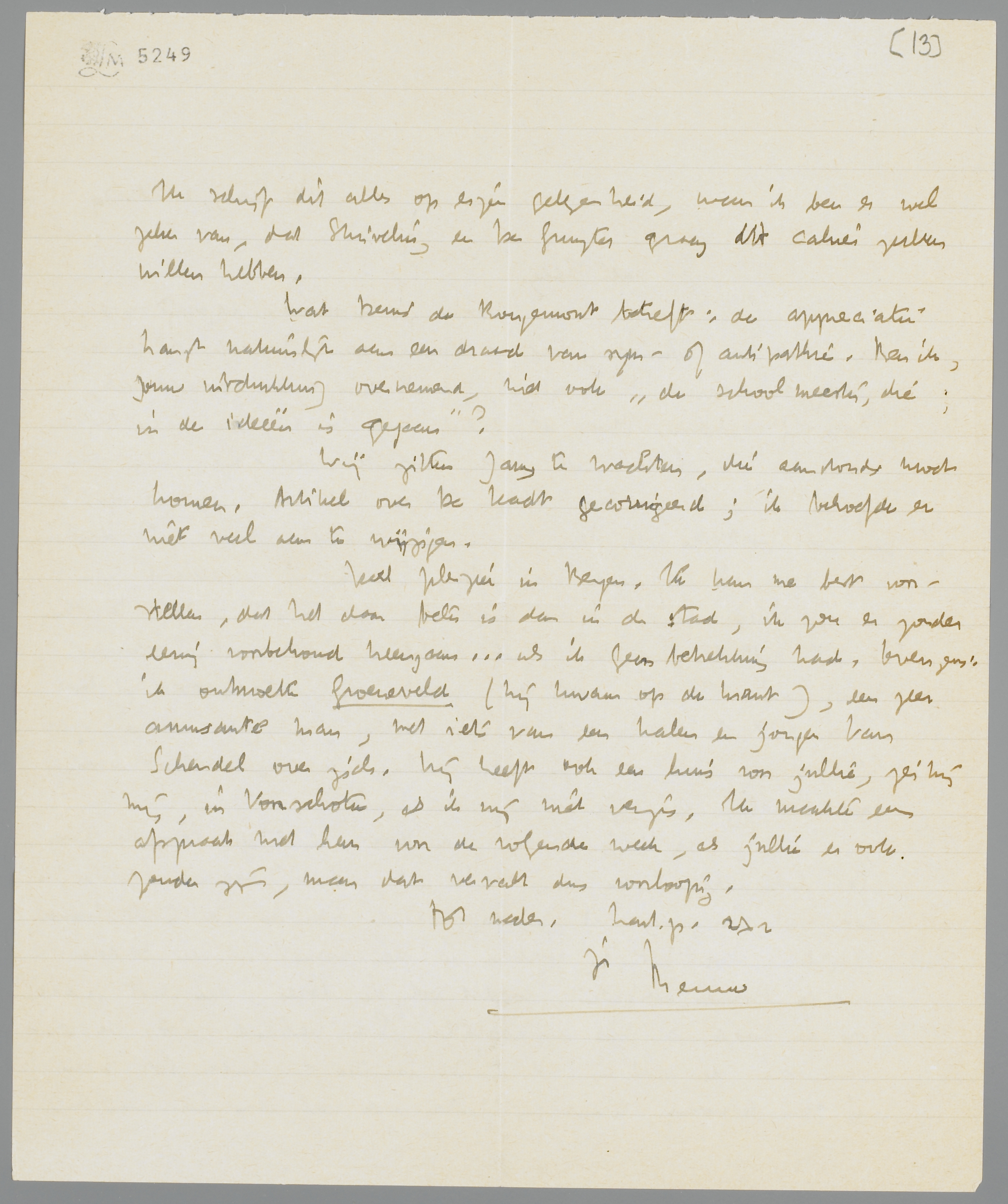De Vrije Bladen gaan door, al heeft Leopold weer iets laten vallen van de ‘verliezen’, die hij daarmee lijdt. Ik voor mij zou graag het Januari-cahier aan de Multatuli-stukken wijden. Doe het bij voorkeur in den vorm van een beredeneerde bronnenpublicatie, zoodat ook de lezer, die niet precies op de hoogte is van de details, het verband ziet. De omvang van de cahiers is ± 32 pagina's, maar iets meer is geen bezwaar, want wij hebben ook wel eens iets minder. Ik schrijf dit alles op eigen gelegenheid, maar ik ben er wel zeker van, dat Stuiveling en De Gruyter graag dit cahier zullen willen hebben.