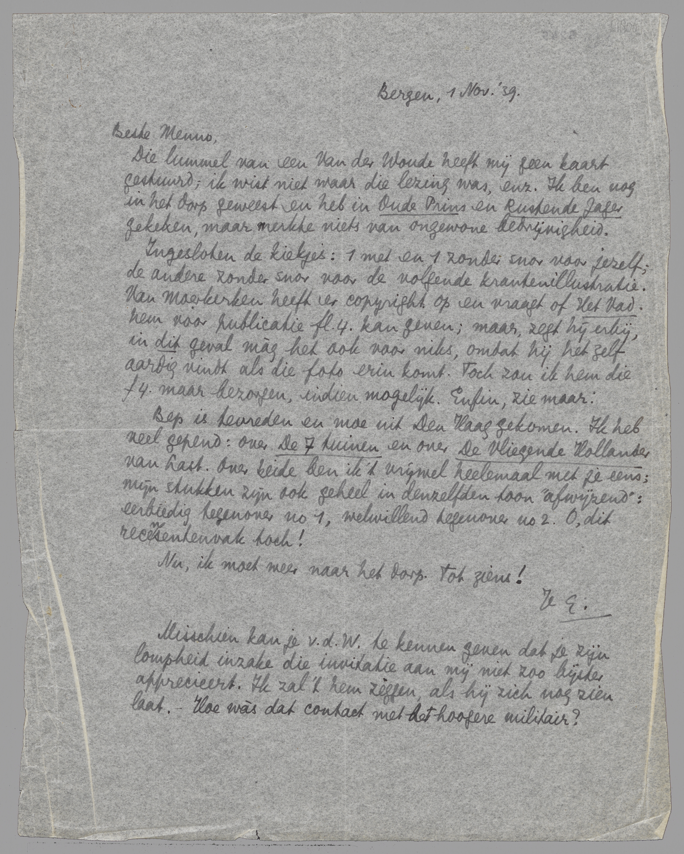 Ingesloten de kiekjes: 1 met en 1 zonder snor voor jezelf; de andere zonder snor voor de volgende krantenillustratie. Van Moerkerken heeft er copyright op en vraagt of Het Vad. hem voor publicatie fl. 4. kan geven; maar, zegt hij erbij, in dit geval màg het ook voor niks, omdat hij het zelf aardig vindt als die foto erin komt. Toch zou ik hem die ƒ 4. maar bezorgen, indien mogelijk. Enfin, zie maar.