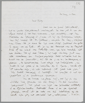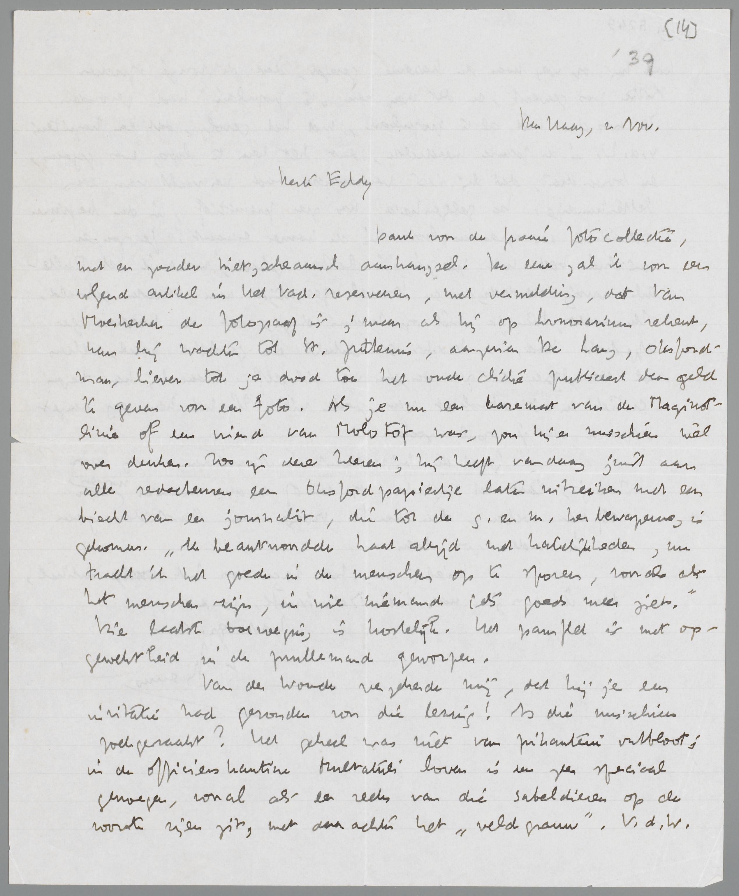 Dank voor de fraaie fotocollectie, met en zonder Nietzscheaansch aanhangsel. De eene zal ik voor een volgend artikel in Het Vad. reserveeren, met vermelding, dat Van Moerkerken de fotograaf is; maar als hij op honorarium rekent, kan hij wachten tot St. Juttemis, aangezien De Lang, Oksfordman, liever tot je dood toe het oude cliché publiceert dan geld te geven voor een foto. Als je nu een kazemat van de Maginotlinie of een vriend van Molotof was, zou hij er misschien wèl over denken. Zoo zijn deze heeren; hij heeft vandaag juist aan alle redacteuren een Oksfordpapiertje laten uitreiken met een biecht van een journalist, die tot de g. en m. herbewapening is gekomen. ‘Ik beantwoordde haat altijd met hatelijkheden, nu tracht ik het goede in de menschen op te sporen, vooral als het menschen zijn, in wie niemand iets goeds meer ziet’. Die laatste toevoeging is kostelijk. Het pamflet is met opgewektheid in de prullemand geworpen.
