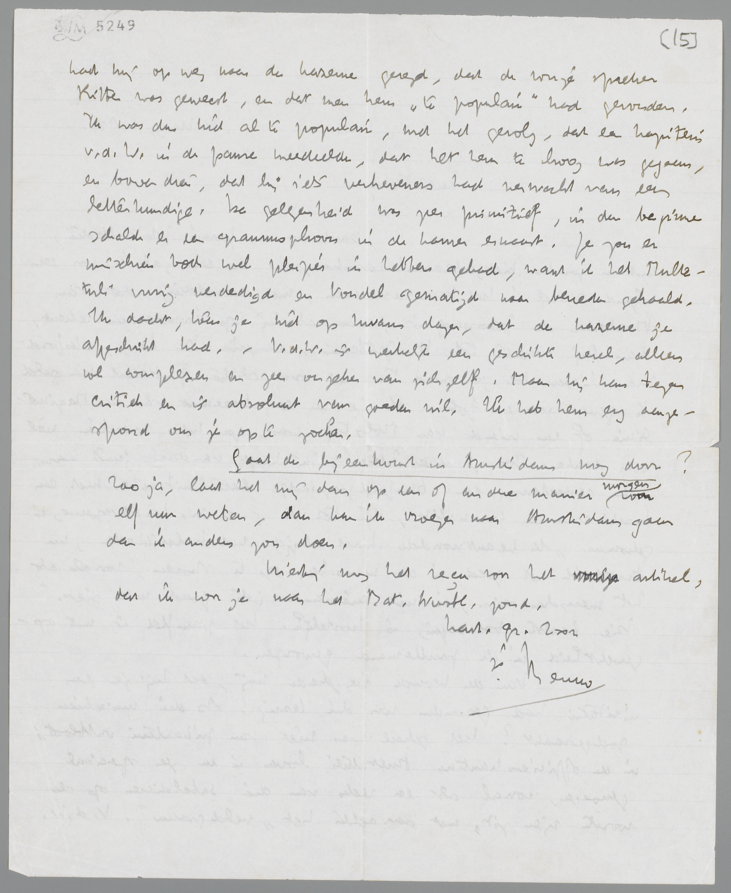 Van der Woude verzekerde mij, dat hij je een invitatie had gezonden voor die lezing! Is die misschien zoekgeraakt? Het geheel was niet van pikanterie ontbloot; in de officierskantine Multatuli loven is een zeer speciaal genoegen, vooral als een reeks van die sabeldieren op de voorste rijen zit, met daarachter het ‘veldgrauw’. V.d.W. had mij op weg naar de kazerne gezegd, dat de vorige spreker Ritter was geweest, en dat men hem ‘te populair’ had gevonden. Ik was dus niet al te populair, met het gevolg, dat een kapitein v.d.W. in de pauze meedeelde, dat het hem te hoog was gegaan, en bovendien, dat hij iets verheveners had verwacht van een letterkundige. De gelegenheid was zeer primitief, in den beginne schalde er een grammophoon in de kamer ernaast. Je zou er misschien toch wel pleizier in hebben gehad, want ik heb Multatuli vurig verdedigd en Vondel gematigd naar beneden gehaald. Ik dacht, toen je niet op kwam dagen, dat de kazerne je afgeschrikt had. - V.d.W. is werkelijk een geschikte kerel, alleen vol complexen en zeer onzeker van zichzelf. Maar hij kan tegen critiek en is absoluut van goeden wil. Ik heb hem aangespoord om je op te zoeken.