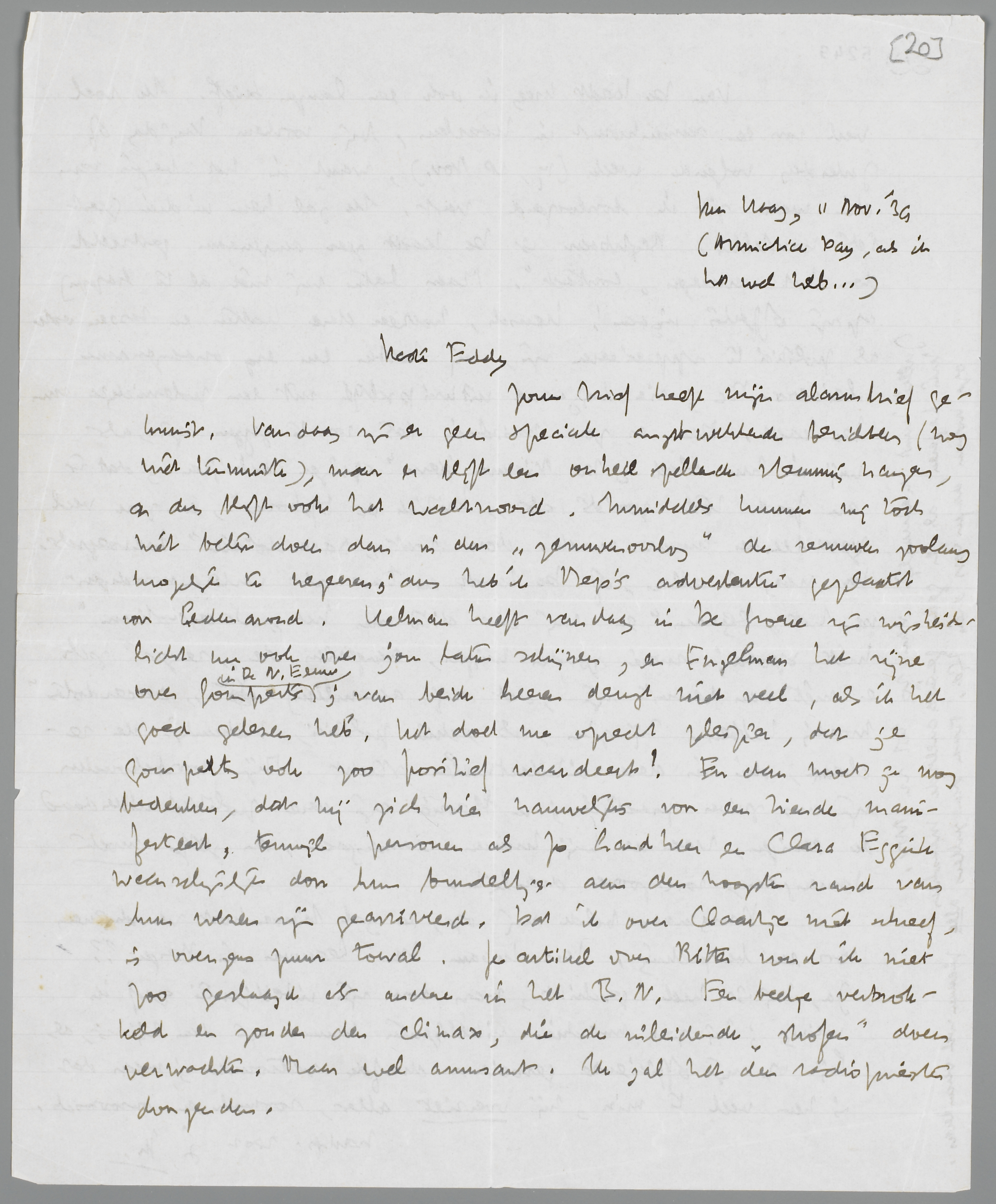 Jouw brief heeft mijn alarmbrief gekruist. Vandaag zijn er geen speciale angstwekkende berichten (nog niet tenminste), maar er blijft een onheilspellende stemming hangen, en dus blijft ook het wachtwoord. Inmiddels kunnen wij toch niet beter doen dan in den ‘zenuwenoorlog’ de zenuwen zoolang mogelijk te negeeren; dus heb ik Bep's advertentie geplaatst voor hedenavond. Helman heeft vandaag in De Groene zijn wijsheidslicht nu ook over jou laten schijnen, en Engelman het zijne over Gomperts in De N. Eeuw; van beide heeren deugt niet veel, als ik het goed gelezen heb. Het doet me oprecht plezier, dat je Gomperts ook zoo positief waardeert! En dan moet je nog bedenken, dat hij zich hier nauwelijks voor een tiende manifesteert, terwijl personen als Jo Landheer en Clara Eggink waarschijnlijk door hun bundeltjes aan den hoogsten rand van hun wezen zijn gearriveerd. Dat ik over Claartje niet schreef, is overigens puur toeval. Je artikel over Ritter vond ik niet zoo geslaagd als andere in het B.N. Een beetje verbrokkeld en zonder den climax, die de inleidende ‘strofen’ doen verwachten. Maar wel amusant. Ik zal het den radiopriester doorzenden.