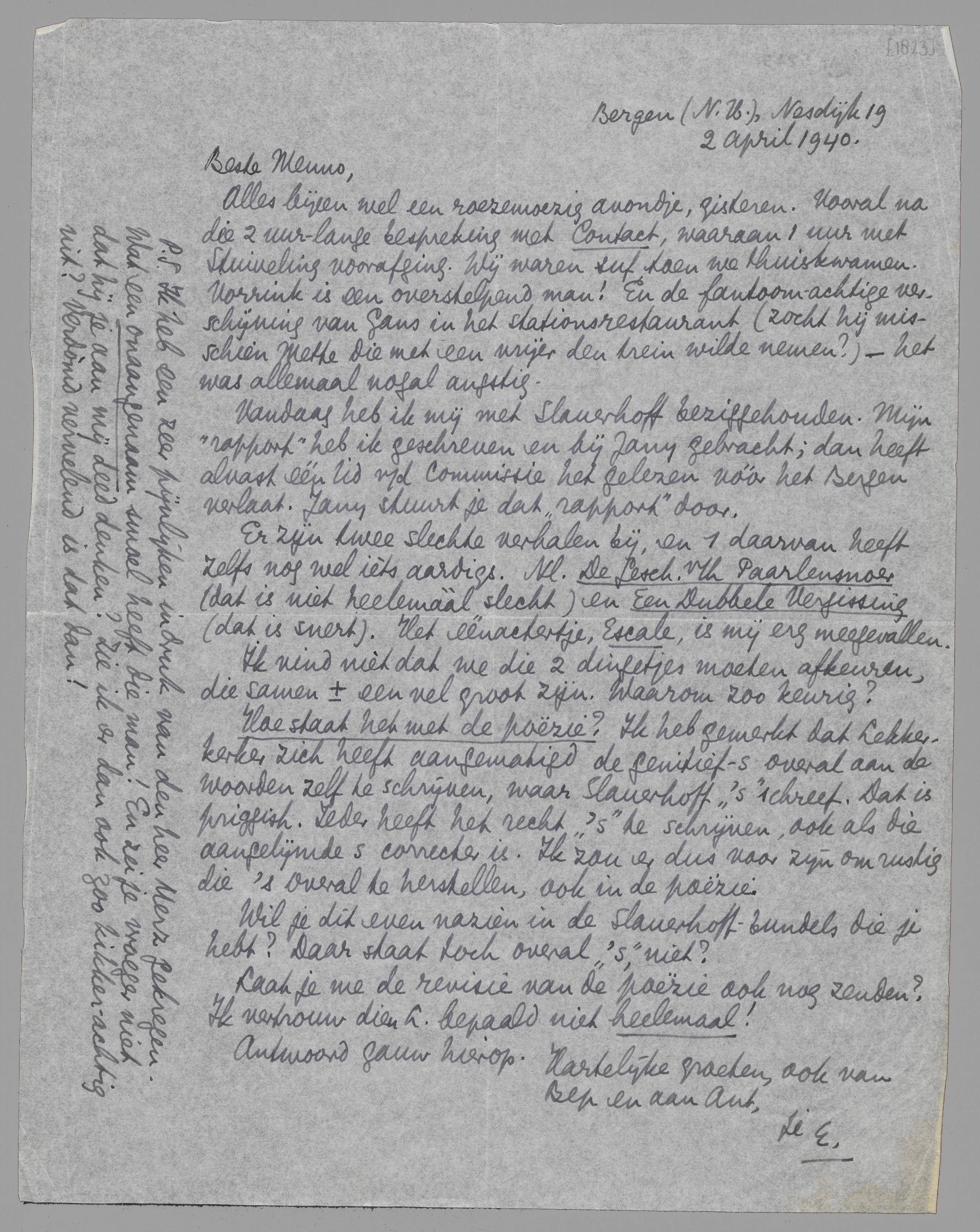 Vandaag heb ik mij met Slauerhoff beziggehouden. Mijn ‘rapport’ heb ik geschreven en bij Jany gebracht; dan heeft alvast één lid v/d Commissie het gelezen vóór het Bergen verlaat. Jany stuurt je dat ‘rapport’ door.