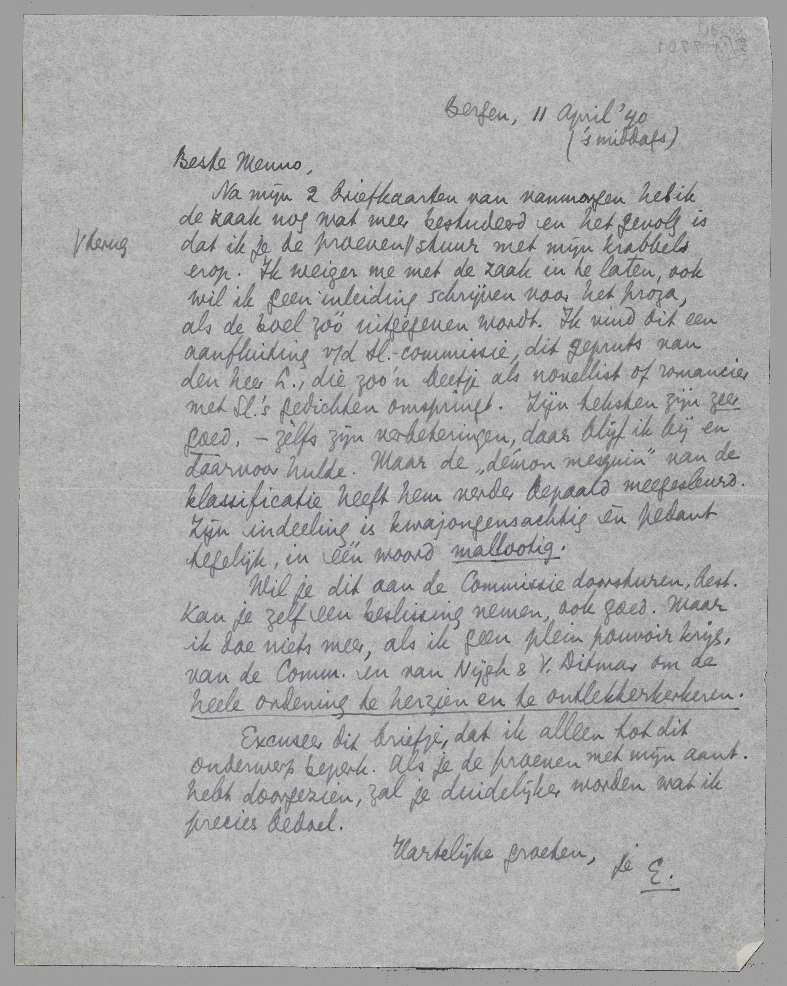 Na mijn 2 briefkaarten van vanmorgen heb ik de zaak nog wat meer bestudeerd en het gevolg is dat ik je de proeven terug stuur met mijn krabbels erop. Ik weiger me met de zaak in te laten, ook wil ik geen inleiding schrijven voor het proza, als de boel zóó uitgegeven wordt. Ik vind dit een aanfluiting v/d Sl.-commissie, dit gepruts van den heer L., die zoo'n beetje als novellist of romancier met Sl.'s gedichten omspringt. Zijn teksten zijn zeer goed, - zélfs zijn verbeteringen, daar blijf ik bij en daarvoor hulde. Maar de ‘démon mesquin’ van de klassificatie heeft hem verder bepaald meegesleurd. Zijn indeeling is kwajongensachtig èn pedant tegelijk, in één woord mallootig.