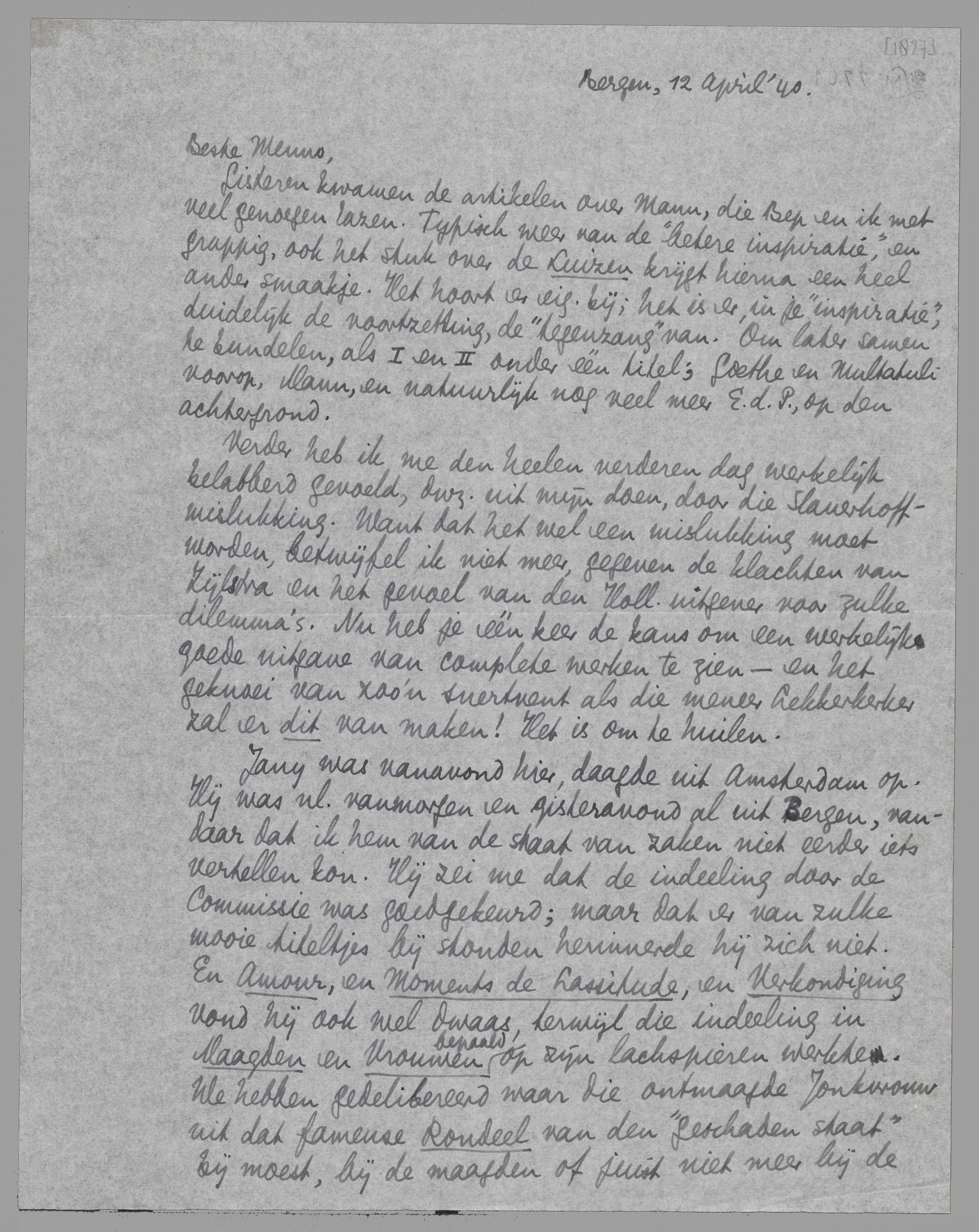 Gisteren kwamen de artikelen over Mann, die Bep en ik met veel genoegen lazen. Typisch weer van de ‘betere inspiratie’, en grappig, ook het stuk over de Luizen krijgt hierna een heel ander smaakje. Het hoort er eig. bij; het is er, in je ‘inspiratie’, duidelijk de voortzetting, de ‘tegenzang’ van. Om later samen te bundelen, als I en II onder één titel; Goethe en Multatuli voorop, Mann, en natuurlijk nog veel meer E.d.P., op den achtergrond.