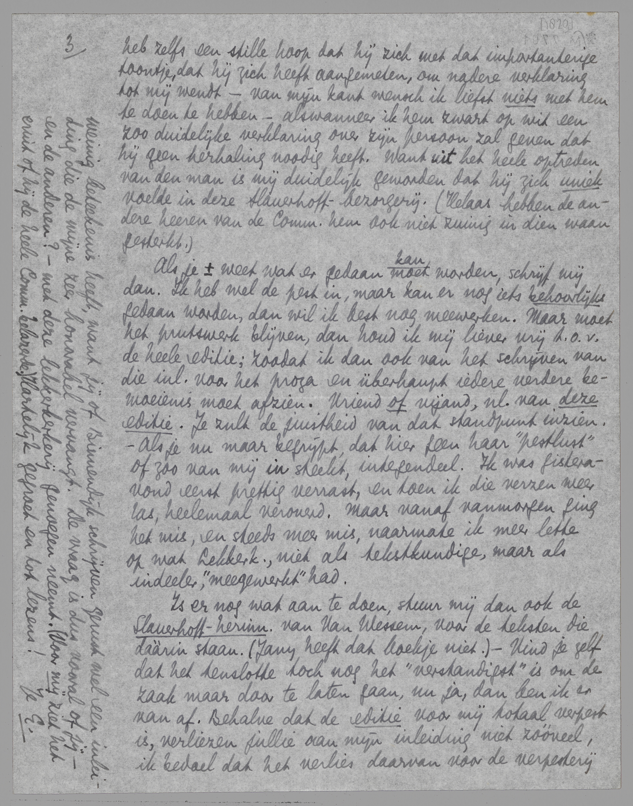 Bekijk jij de zaak met ‘rustige intelligentie’, want ik heb er alleen maar de smoor over in en heb eig. maar één behoefte: dien zich zoo important voelenden heer in Brussel precies te vertellen wat ik van hem denk. Ik heb zelfs een stille hoop dat hij zich met dat importanterige toontje, dat hij zich heeft aangemeten, om nadere verklaring tot mij wendt - van mijn kant wensch ik liefst niets met hem te doen te hebben - alswanneer ik hem zwart op wit een zoo duidelijke verklaring over zijn persoon zal geven dat hij geen herhaling noodig heeft. Want uit het heele optreden van den man is mij duidelijk geworden dat hij zich uniek voelde in deze Slauerhoff-bezorgerij. (Helaas hebben de andere heeren van de Comm. hem ook niet zuinig in dien waan gesterkt.)