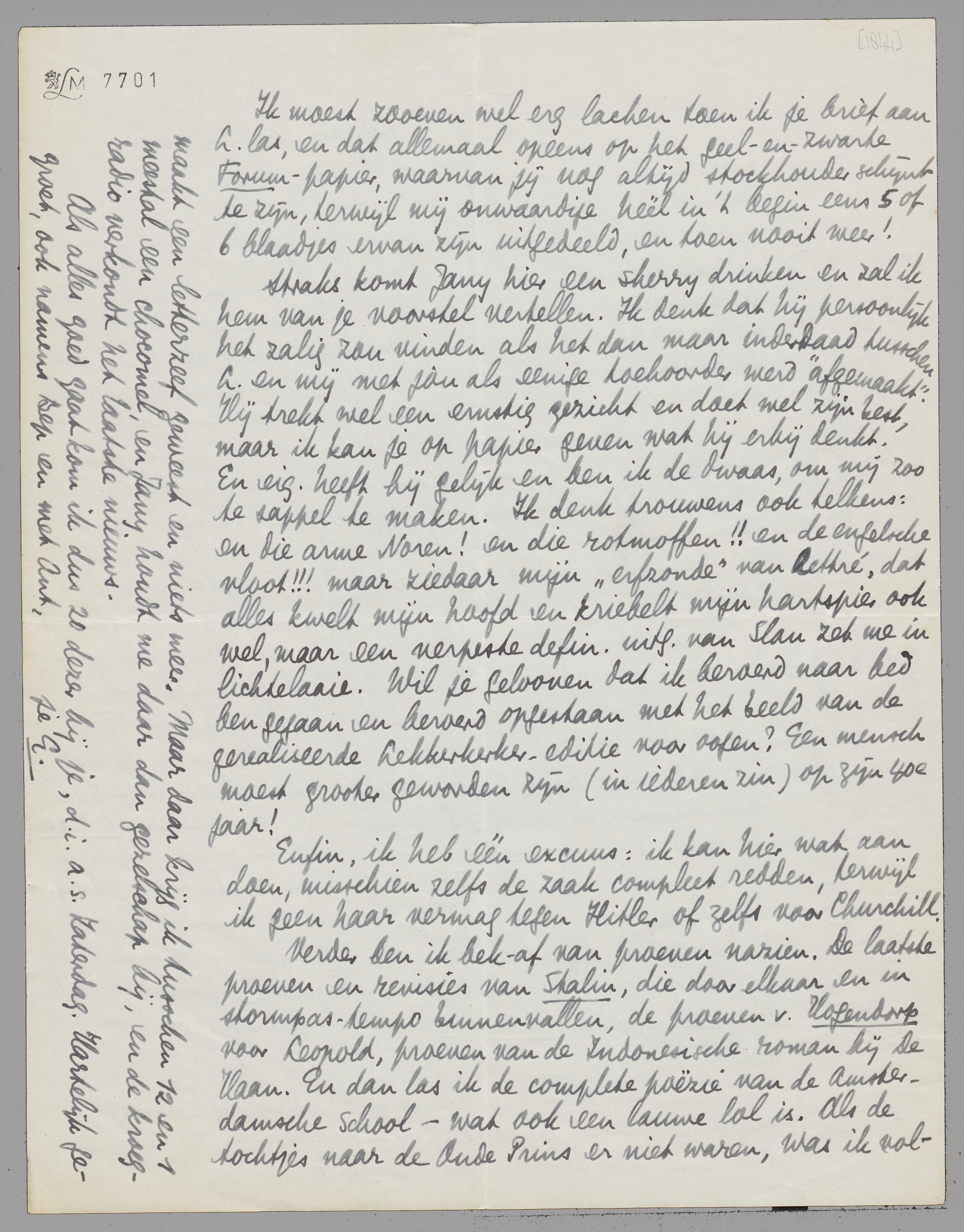 Straks komt Jany hier een sherry drinken en zal ik hem van je voorstel vertellen. Ik denk dat hij persoonlijk het zalig zou vinden als het dan maar inderdaad tusschen L. en mij met jou als eenige toehoorder werd ‘afgemaakt’. Hij trekt wel een ernstig gezicht en doet wel zijn best, maar ik kan je op papier geven wat hij erbij denkt. En eig. heeft hij gelijk en ben ik de dwaas, om mij zoo te sappel te maken. Ik denk trouwens ook telkens: en die arme Noren! en die rotmoffen!! en de engelsche vloot!!! maar ziedaar mijn ‘erfzonde’ van lettreé, dat alles kwelt mijn hoofd en kriebelt mijn hartspier ook wel, maar een verpeste defin. uitg. van Slau zet me in lichtelaaie. Wil je gelooven dat ik beroerd naar bed ben gegaan en beroerd opgestaan met het beeld van de gerealiseerde Lekkerkerker-editie voor oogen? Een mensch moest grooter geworden zijn (in iederen zin) op zijn 40e jaar!