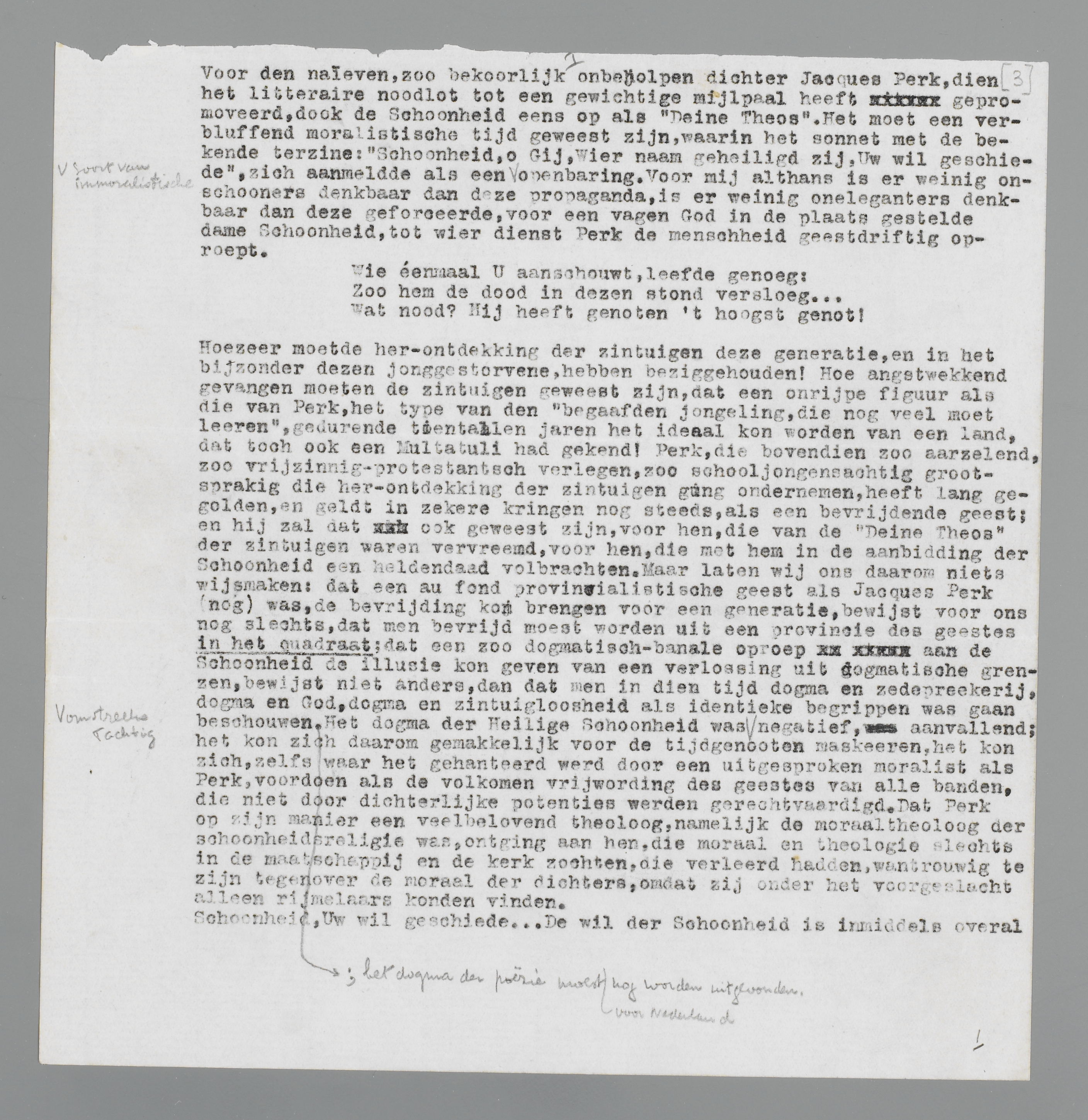 Voor den naïeven, zoo bekoorlijk onbeholpen dichter Jacques Perk, dien het litteraire noodlot tot een gewichtige mijlpaal heeft gepromoveerd, dook de Schoonheid eens op als ‘Deine Theos’. Het moet een verbluffend moralistische tijd geweest zijn, waarin het sonnet met de bekende terzine: ‘Schoonheid, o Gij, Wier naam geheiligd zij, Uw wil geschiede’, zich aanmeldde als een soort van immoralistische openbaring. Voor mij althans is er weinig onschooners denkbaar dan deze propaganda, is er weinig oneleganters denkbaar dan deze geforceerde, voor een vagen God in de plaats gestelde dame Schoonheid, tot wier dienst Perk de menschheid geestdriftig oproept.