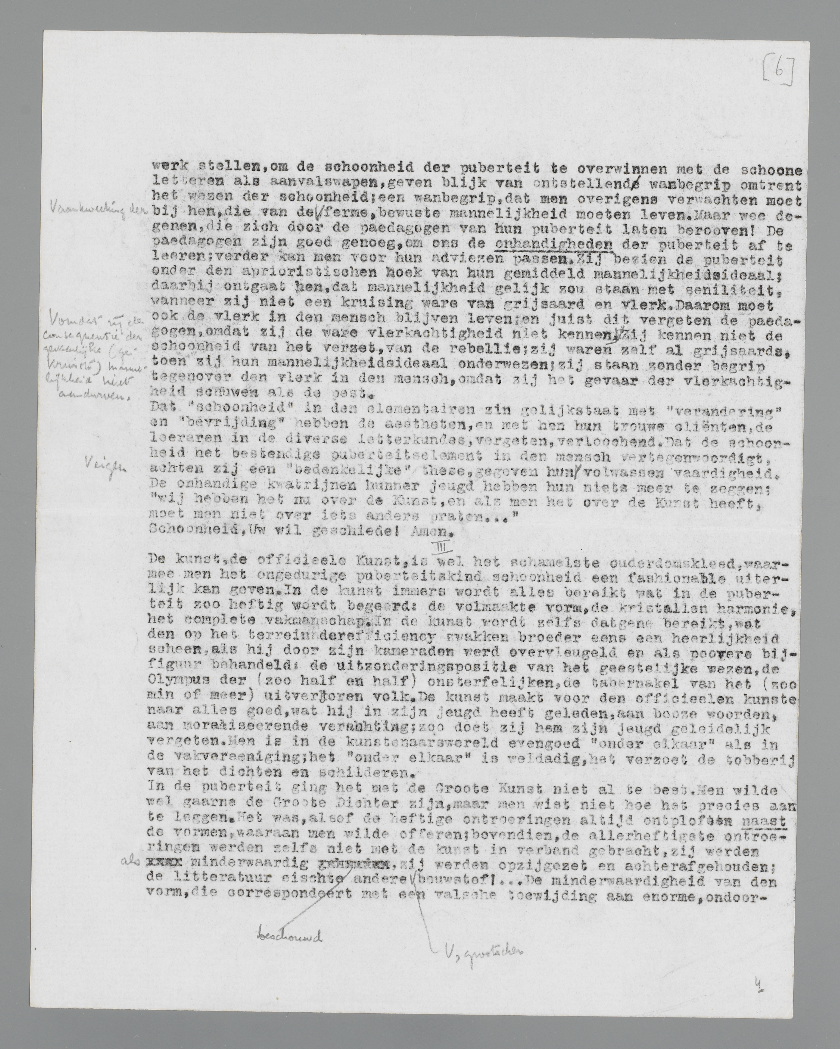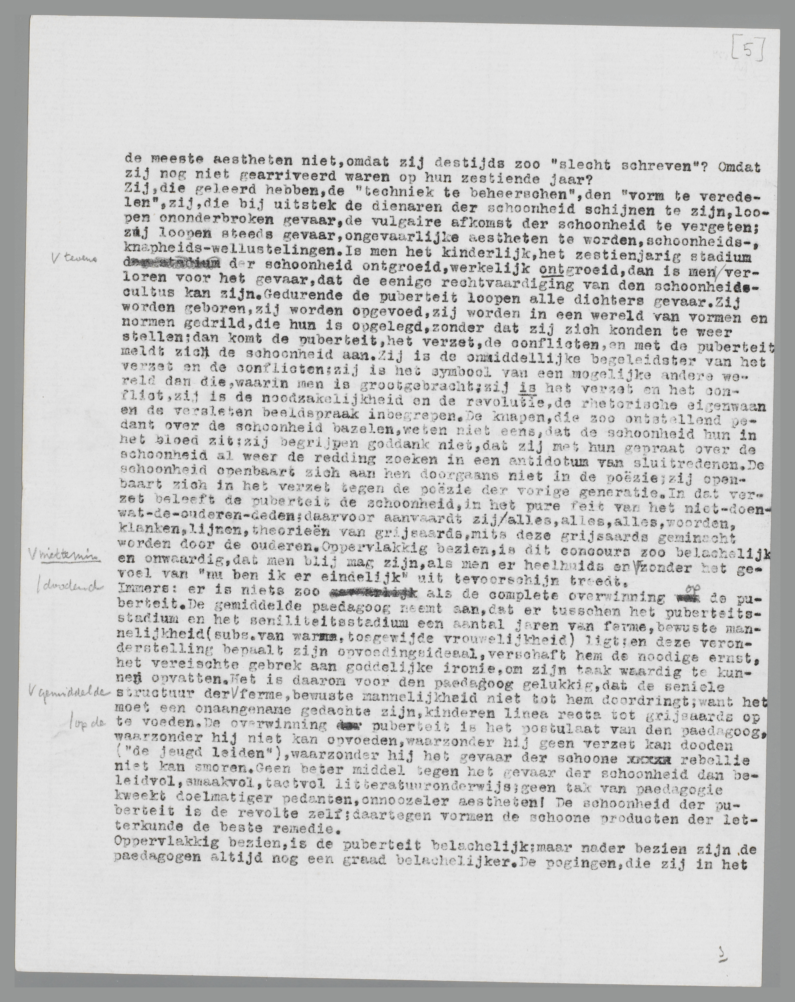 dooddrukken van de puberteit is het postulaat van den paedagoog, waarzonder hij niet kan opvoeden, waarzonder hij geen verzet kan uitroeien (‘de jeugd leiden’), waarzonder hij het gevaar der schoone rebellie niet kan smoren. Geen beter middel tegen het gevaar der schoonheid dan beleidvol, smaakvol, tactvol litteratuuronderwijs; geen tak van paedagogie kweekt doelmatiger pedanten, onnoozeler aestheten! De schoonheid der puberteit is niet de schoone litteratuur, maar de révolte zelf; daartegen vormen dan ook de schoone producten der letterkunde de beste remedie.