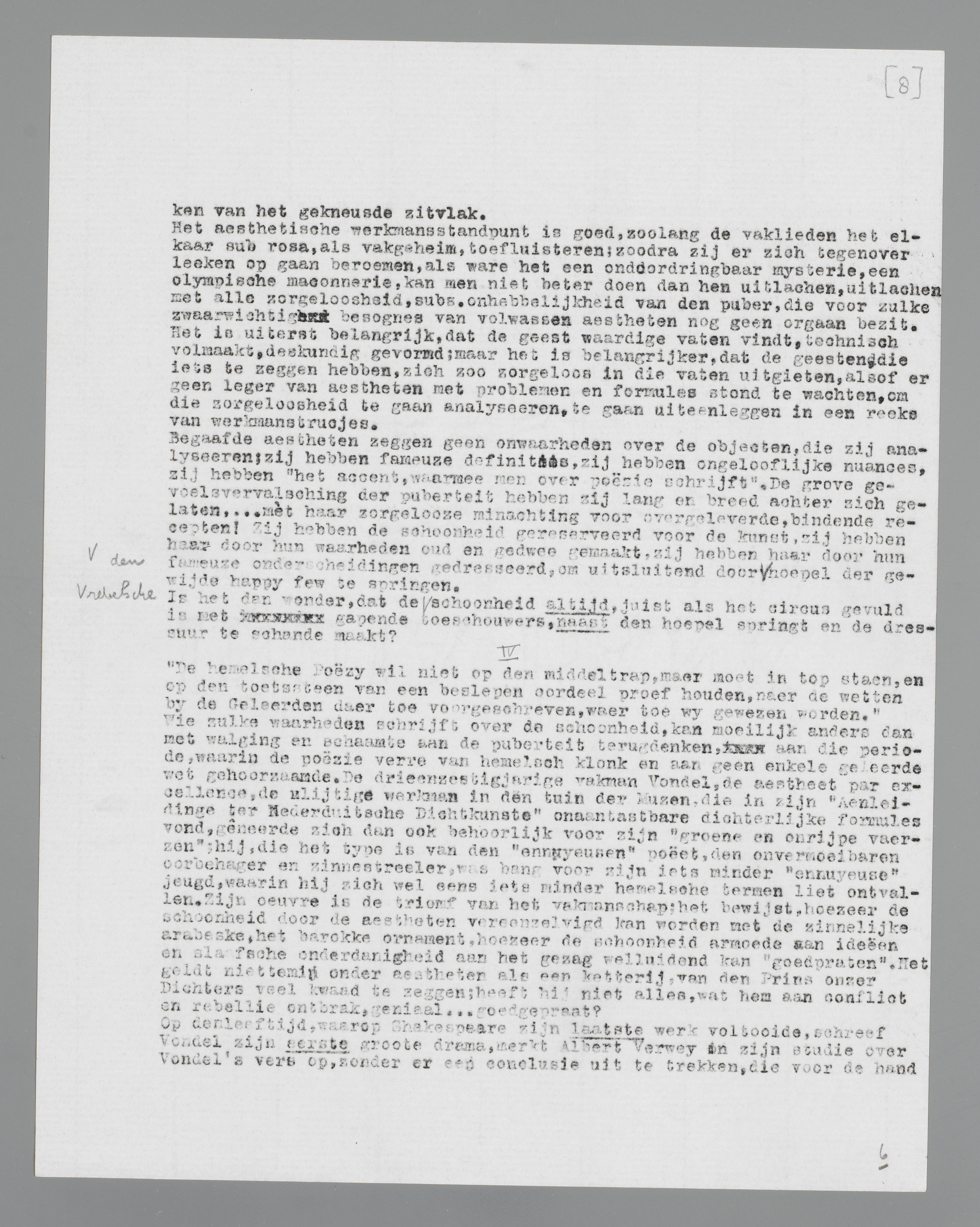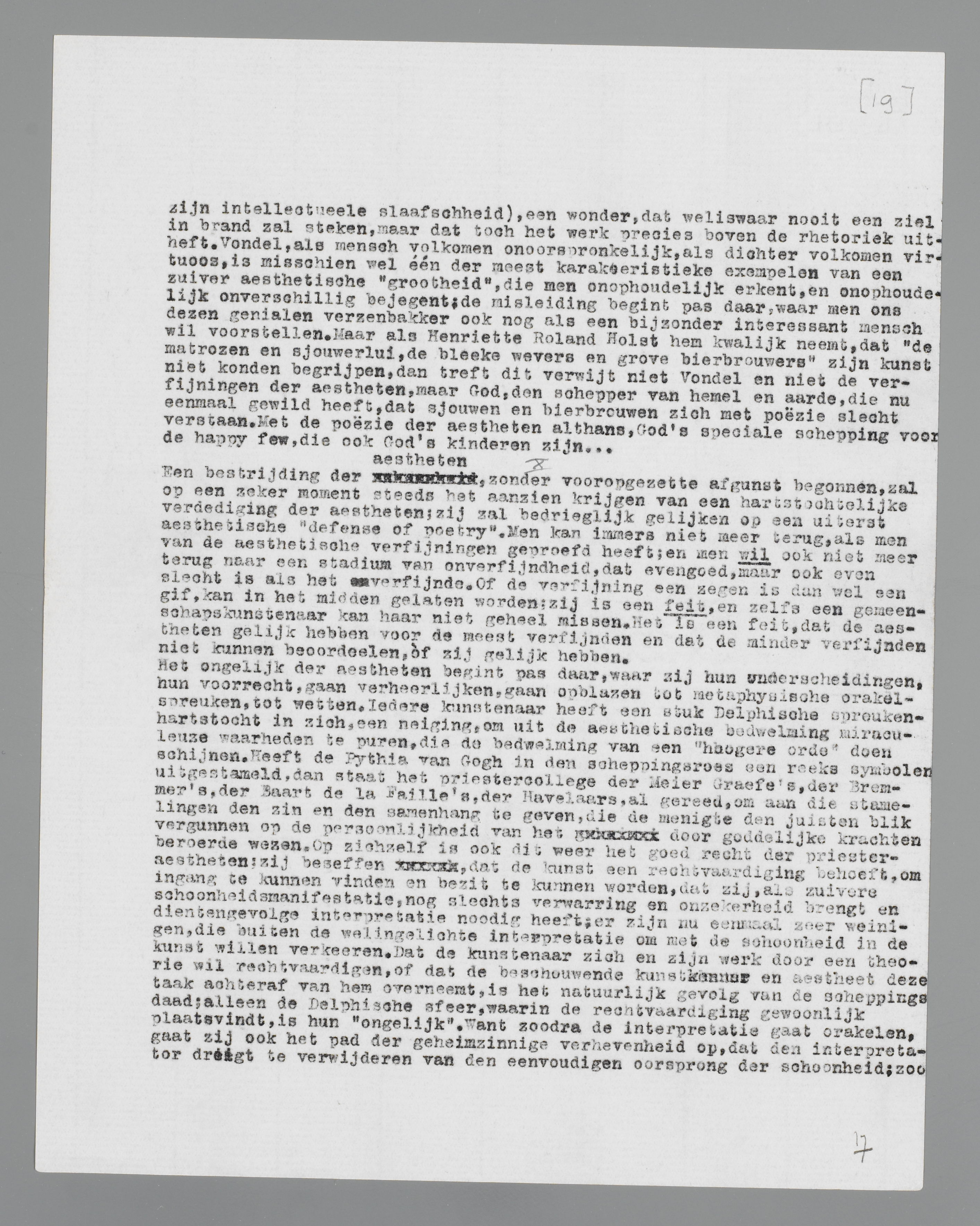 Zelfs de hevigste afkeer van het type ‘aestheet’ mag geen aanleiding zijn, de methode der populaire dilettanten en afval-aestheten toe te juichen; met die methode heeft een werkelijk verworven afkeer trouwens niets gemeen. Ik heb den dichter Vondel steeds bewonderd om de constante superioriteit van zijn vakmanschap, ook al heeft geen zijner gedichten en geen zijner tragedies mij kunnen doen vergeten, dat zijn ‘Lucifer’ een hoogst onnoozele godheid veronderstelt, tegenover wie Vondel zich even onnoozel gedraagt als Lucifer zelf; het marmeren portret en de marmeren theorieën van Stefan George dwingen mij een oprechte bewondering af voor een gedegen dichterlijk vakmanschap, ook al doet mij dit nog niet gelooven in de ‘geheel aparte wereld’ der poëzie, waaruit Nijhoff op Dinsdag het goddelijke ‘Wilhelmus’ zingt. De taalvirtuositeit blijft, juist bij zulk een vervelenden dichter als Vondel onmiskenbaar is (want de massieve vorm van zijn oeuvre is in geen enkel opzicht in overeenstemming met zijn geringe menschenkennis en zijn intellectueele slaafschheid), een wonder, dat weliswaar nooit een ziel in brand zal steken, maar dat toch het werk precies boven de rhetoriek uitheft. Vondel, als mensch volkomen onoorspronkelijk, als dichter volkomen virtuoos, is misschien wel één der meest karakteristieke exempelen van een zuiver aesthetische ‘grootheid’, die men onophoudelijk erkent, en onophou-