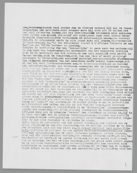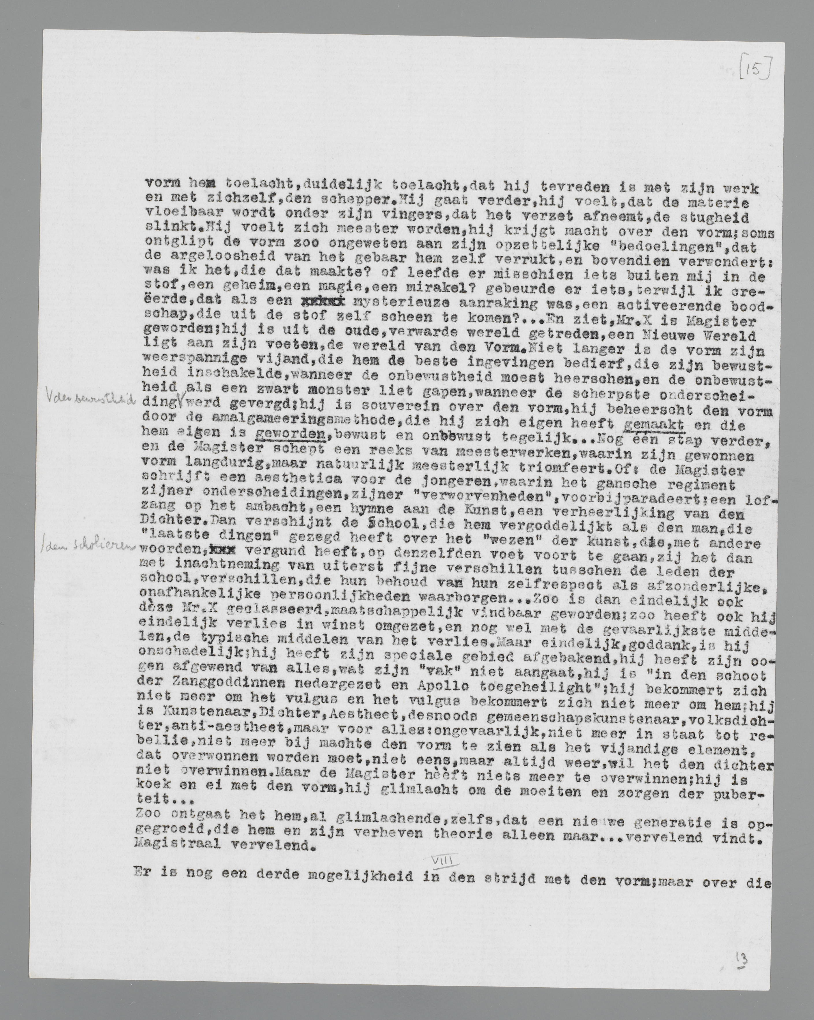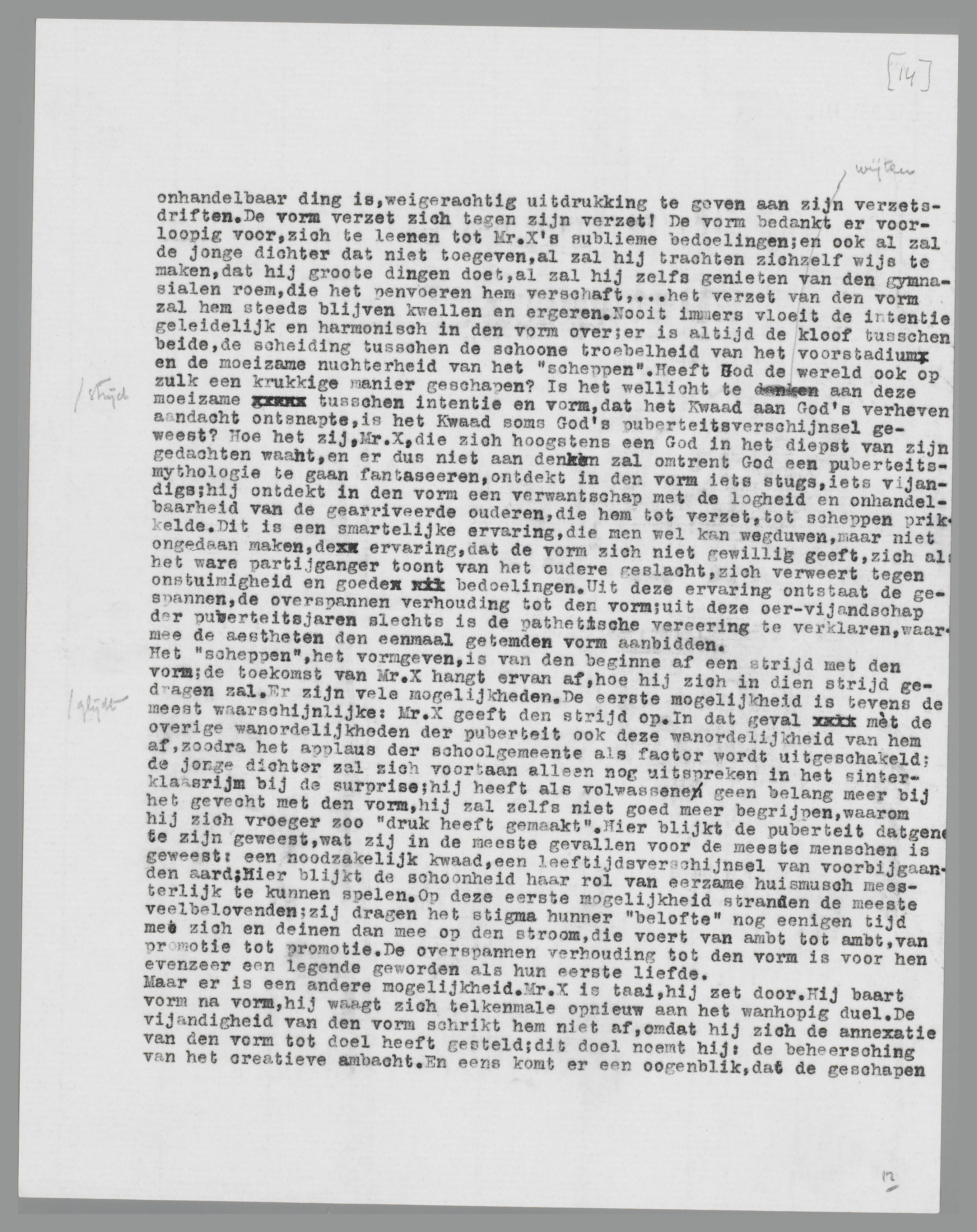 Het ‘scheppen’, het vormgeven, is van den beginne af een strijd met den vorm; de toekomst van mr. X. hangt ervan af, hoe hij zich in dien strijd gedragen zal. Er zijn vele mogelijkheden. De eerste mogelijkheid is tevens de meest waarschijnlijke: Mr. X. geeft den strijd op. In dat geval glijdt mèt de overige wanordelijkheden der puberteit ook deze wanordelijkheid van hem af, zoodra het applaus der schoolgemeente als factor wordt uitgeschakeld; de jonge dichter zal zich voortaan alleen nog uitspreken in sinterklaasrijm of journalistiek; hij heeft als volwas-