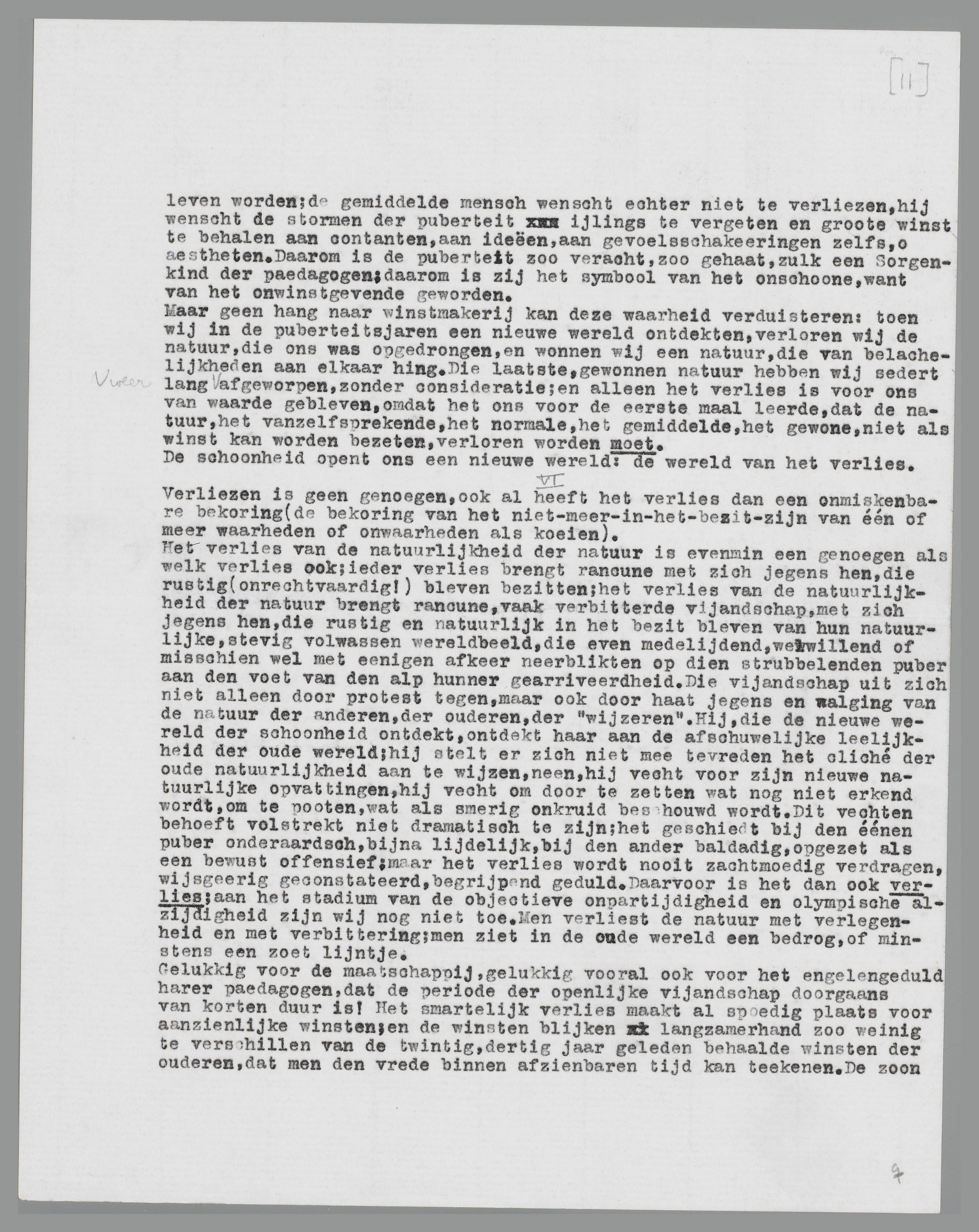 Aldus opent de schoonheid ons een nieuwe wereld. In een baaierd van de meest schrille en valsche contrasten, van de grofste accenten en de dolste situaties gaat ons een licht op. De natuur verliest haar natuurlijkheid, weliswaar om terstond in een andere holderdebolder-natuur, een soort groteske afspiegeling van de juist verloren natuur, te worden omgezet, maar met één winstpunt: het verlies. Wie eenmaal verloren heeft, en wie bovendien het talent heeft, om te kunnen verliezen, die zal nooit meer geheel aan de bekoring van het verlies ontkomen, die zal nooit meer geheel opgaan in de tallooze maatschappelijke natuurlijkheden, die hem tusschen zijn achttiende en tachtigste jaar worden geboden. Het verlies van de natuurlijke natuur in de puberteit kàn een onvergetelijke handleiding voor het leven worden; de gemiddelde mensch wenscht echter niet te verliezen, hij wenscht de stormen der puberteit ijlings te vergeten en groote winst te behalen aan contanten, aan ideeën, aan gevoelsschakeeringen zelfs, o aestheten. Daarom is de puberteit later zoo veracht, zoo gehaat, zulk een Sorgenkind der paedagogen; daarom is zij het symbool van het onschoone, want van het onwinstgevende geworden.