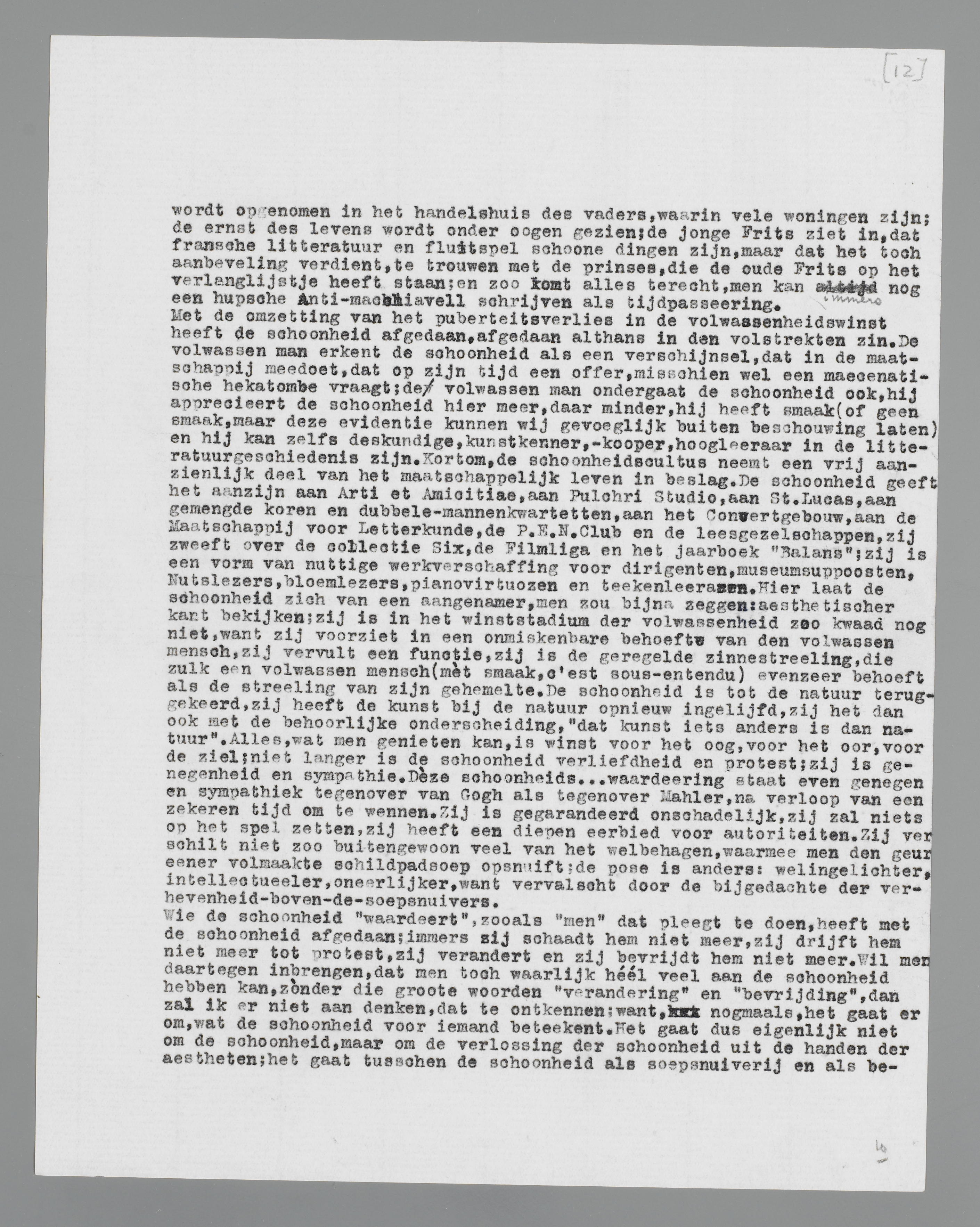 schoonheid zich van een aangenamer, men zou bijna zeggen: aesthetischer kant bekijken; zij is in het winststadium der volwassenheid zoo kwaad nog niet, want zij voorziet in een onmiskenbare behoefte van den volwassen mensch, zij vervult een functie, zij is de geregelde zinnestreeling, die zulk een volwassen mensch (mèt smaak, c'est sous-entendu) evenzeer behoeft als de streeling van zijn gehemelte. De schoonheid heeft haar loket gekregen, zij heeft de kunst bij de natuur opnieuw ingelijfd, zij het dan ook met de behoorlijke onderscheiding, ‘dat kunst iets anders is dan natuur’. Alles, wat men genieten kan, is winst voor het oog, voor het oor, voor de ziel; niet langer is de schoonheid verliefdheid en protest; zij is genegenheid en sympathie. Dèze schoonheids....waardeering staat even genegen en sympathiek tegenover van Gogh als tegenover Mahler, na verloop van een zekeren tijd om te wennen. Zij is gegarandeerd onschadelijk, zij zal niets op het spel zetten, zij heeft een diepen eerbied voor autoriteiten. Zij verschilt niet zoo buitengewoon veel van het welbehagen, waarmee men den geur eener volmaakte schildpadsoep opsnuift; de pose is anders: welingelichter, intellectueeler, oneerlijker, want vervalscht door de bijgedachte der verhevenheid-boven-de-soepsnuivers.