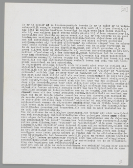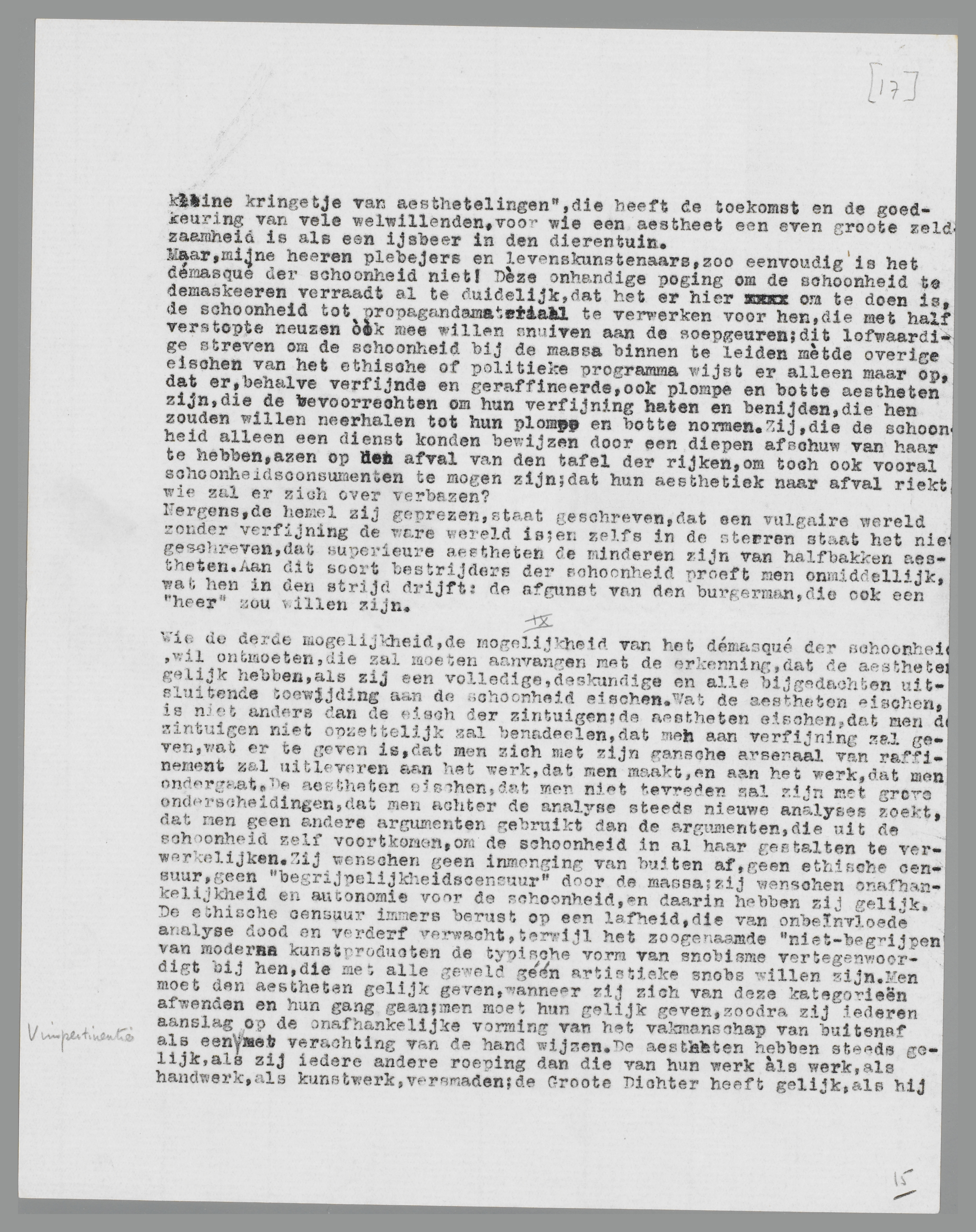 Een bestrijding der aestheten, zonder vooropgezette afgunst begonnen, zal op een zeker moment steeds het aanzien krijgen van een hartstochtelijke verdediging der aestheten; zij zal bedriegelijk gelijken op een uiterst aesthetische ‘defense of poetry’. Men kan immers niet meer terug, als men van de aesthetische verfijningen geproefd heeft; en men wil ook niet meer terug naar een stadium van onverfijndheid, dat evengoed, maar ook even slecht is als het verfijnde. Of de verfijning een zegen is dan wel een gif, kan in het midden gelaten worden; zij is een feit, en zelfs een gemeenschapskunstenaar kan haar niet geheel missen. Het is een feit, dat de aestheten gelijk hebben voor de meest verfijnden en dat de minder verfijnden niet kunnen beoordeelen, òf zij gelijk hebben.