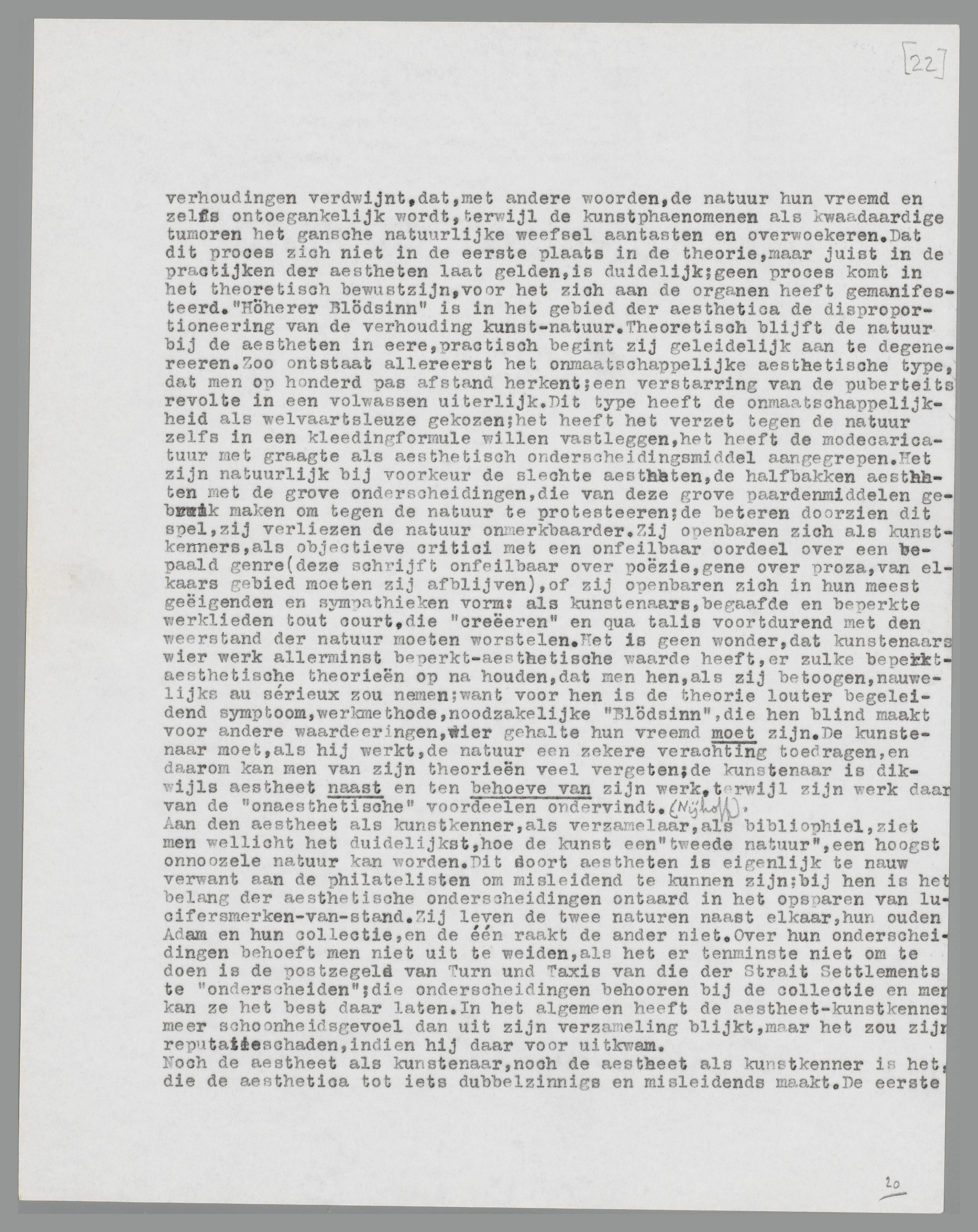 Men kan deze neiging tot coquetterie met God en zijn scheppingsdaden beschouwen als een gebrek aan humor, maar ook als een vorm van ‘höherer Blödsinn’. Het is een bij aestheten veel voorkomend verschijnsel, dat door de toewijding besteed aan de aesthetische onderscheidingen alle zin voor verhoudingen verdwijnt, dat, met andere woorden, de natuur hun vreemd en zelfs ontoegankelijk wordt, terwijl de kunstphaenomenen als kwaadaardige tumoren het gansche natuurlijke weefsel aantasten en overwoekeren. Dat dit proces zich niet in de eerste plaats in de theorie, maar juist in de practijken der aestheten laat gelden, is duidelijk; geen proces komt in het theoretisch bewustzijn, voor het zich aan de organen heeft gemanifesteerd. ‘Höherer Blödsinn’ is in het gebied der aesthetica de disproportioneering van de verhouding kunst-natuur. Theoretisch blijft de natuur bij de aestheten in eere, practisch begint zij geleidelijk aan te degenereeren. Zoo ontstaat allereerst het onmaatschappelijke artisten-type, dat men op honderd pas afstand herkent; een verstarring van de puberteitsrévolte in een volwassen uiterlijk. Dit type heeft de onmaatschappelijkheid als welvaartsleuze gekozen; het heeft het verzet tegen de natuur zelfs in een kleedingformule willen vastleggen, het heeft de flodderdas en de sandalen met graagte als aesthetisch onderscheidingsmiddel aangegrepen. Het zijn natuurlijk bij voorkeur de slechte aestheten, de halfbakken aestheten met de grove onderscheidingen, die van deze grove paardenmiddelen gebruik maken om tegen de natuur te protesteeren; de beteren doorzien dit spel, de ‘Blödsinn’ besluipt hen onmerkbaarder. Zij openbaren zich als kunstkenners, als objectieve critici met een onfeilbaar oordeel over een bepaald