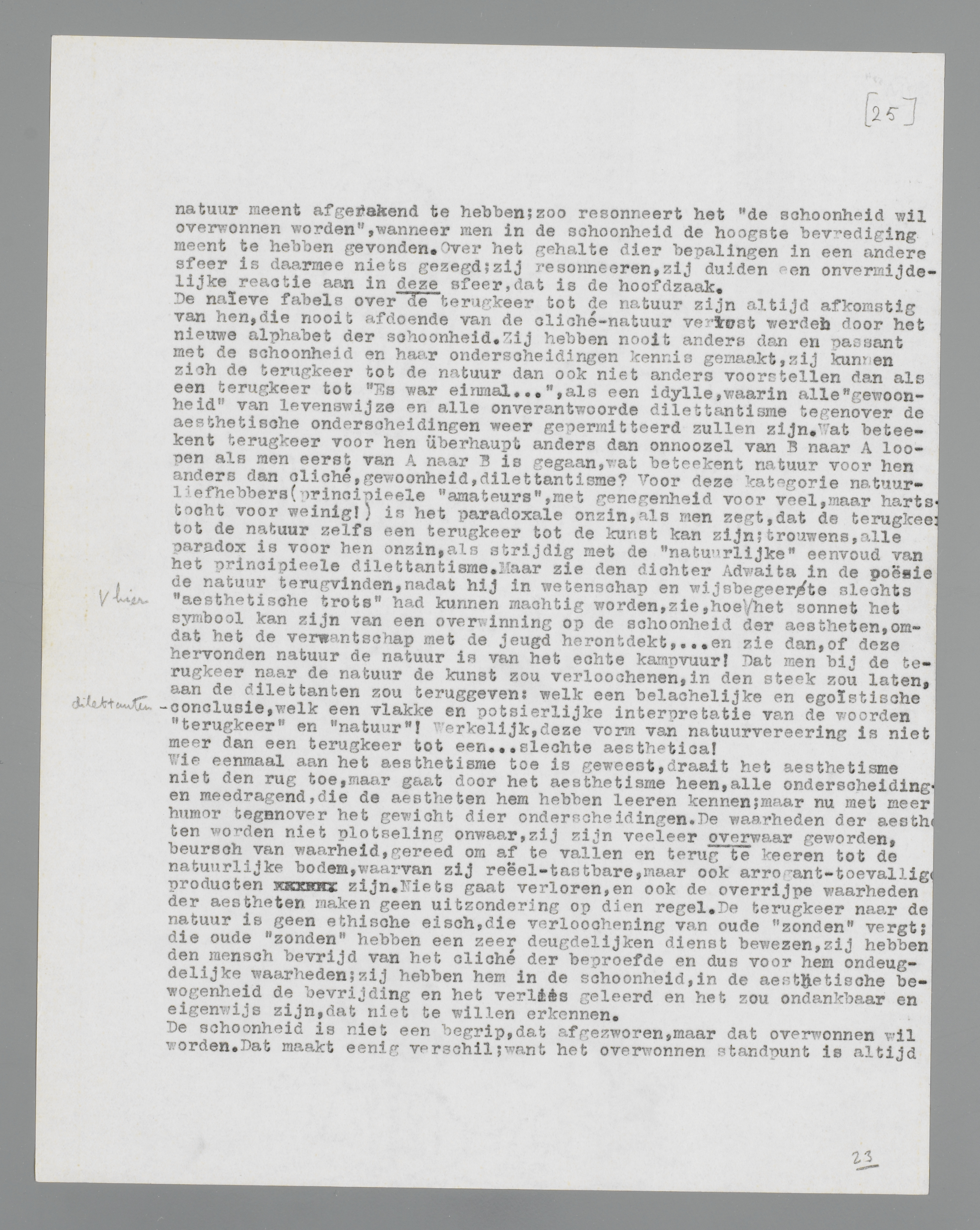 ‘verandering’ en ‘bevrijding’ hebben de aestheten, en met hen hun trouwe cliënten, de leeraren in de diverse letterkundes, vergeten, verloochend. Dat de schoonheid het bestendige puberteitselement in den mensch vertegenwoordigt, achten zij een ‘bedenkelijke’ these, gegeven hun eigen volwassen vaardigheid. De onhandige kwatrijnen hunner jeugd hebben hun niets meer te zeggen; ‘wij hebben het nu over de Kunst, en als men het over de Kunst heeft, moet men niet over iets anders praten....’