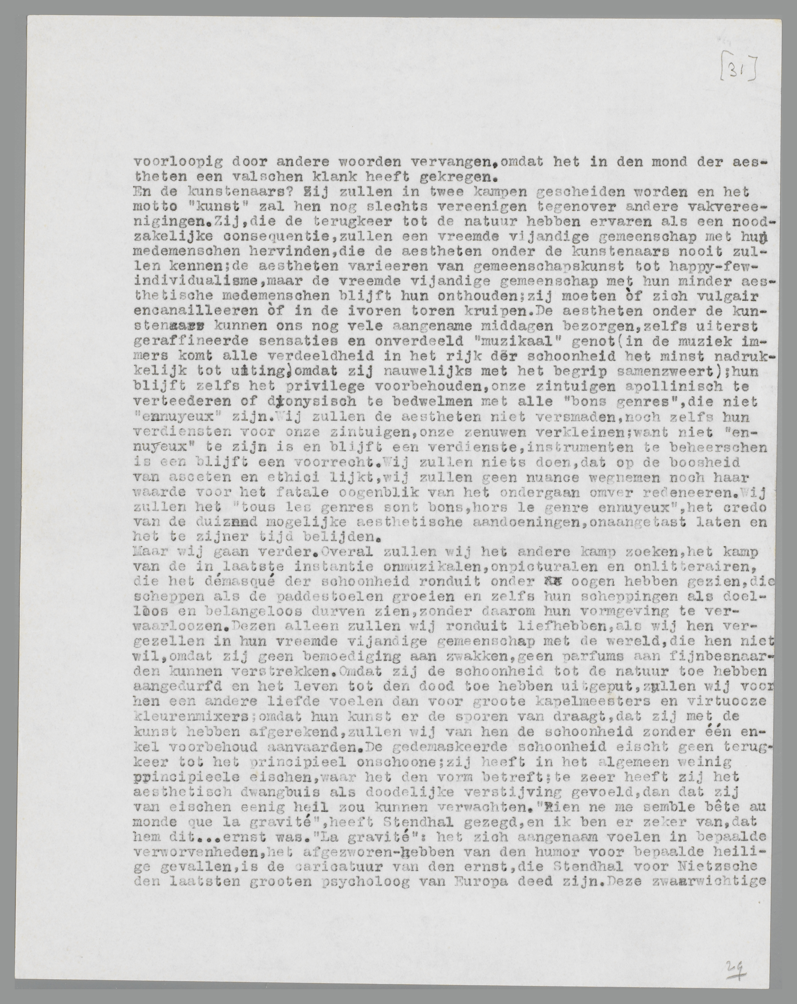 Maar wij gaan verder. Overal zullen wij het andere kamp zoeken; het kamp van de in laatste instantie onmuzikalen, onpicturalen en onlitterairen, die het démasqué der schoonheid ronduit onder oogen hebben gezien, die scheppen als de paddestoelen groeien en zelfs hun scheppingen als doelloos en belangeloos durven zien, zonder daarom hun vormgeving te verwaarloozen. Dezen alleen zullen wij ronduit liefhebben, als wij hen vergezellen in hun vreemde vijandige gemeenschap met de wereld, die hen niet wil, omdat zij geen bemoediging aan zwakken, geen parfums aan fijnbesnaarden kunnen verstrekken. Om-