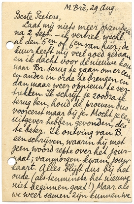 Laat mij niets meer opzenden na 2 Sept. - ik vertrek wschl. al den 5en of 6en van hier; de kuur heeft mij veel goed gedaan en ik dacht voor de nieuwe kou naar Br. terug te gaan om er een en ander in orde te brengen en dan maar weer opnieuw te vertrekken. Ik schrijf je zoodra ik terug ben, houd de proeven dus vooreerst maar bij je. Mocht je een uitgever hebben gevonden, des te beter. Ik ontving van B. een schrijven, waarin hij met geen woord repte over het journaal15; vanmorgen kwam jouw kaart. Alles blijft dus bij het oude (als tenminste het nieuwe niet beginnen gaat!) Maar als we weer samen zijn kunnen we dit beter bespreken, ik moet ook mijn vader daarvoor in den arm nemen. Zooals gezegd heb ik hier vrij veel gewerkt; je zult wel zien.16 Ik voel mij uitstekend en ‘combattif’. Nu - tot spoedig dus - hartelijke groeten aan u beiden van steeds je