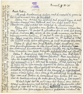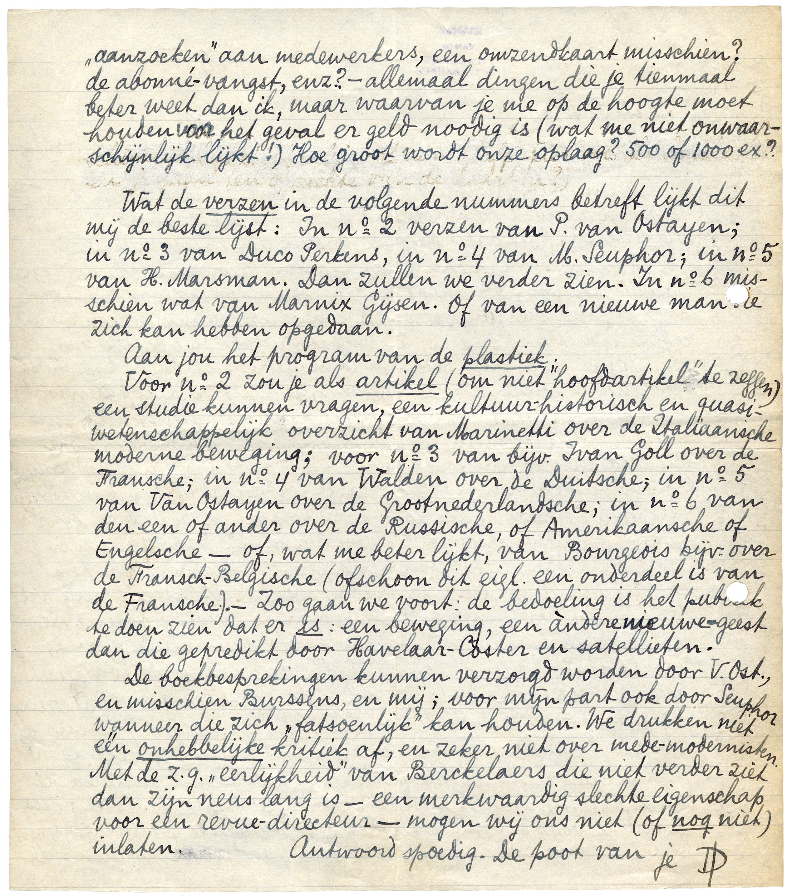 Wat de verzen in de volgende nummers betreft lijkt dit mij de beste lijst; in no 2 verzen van P. van Ostayen; in no 3 van Duco Perkens, in no 4 van M. Seuphor; in no 5 van H. Marsman. Dan zullen we verder zien. In no 6 misschien wat van Marnix Gijsen. Of van een nieuwe man die zich kan hebben opgedaan.