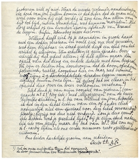 Willink heeft zich op je aanraden in groote haast met een dokter verstaan en voelt zich nu veel geruster, wat hem blijkbaar in staat gesteld heeft een stuk van het artikel te schrijven. Van schelden is geen sprake. Overigens schrijft hij het geheel alleen; ik heb alleen maar den opzet van het ding en enkele details met hem besproken. We zijn er beiden van doordrongen dat de toon, ofschoon polemisch, rustig, hoogstens hier en daar wat ironisch, moet zijn; z.g. hartstochtelijke tiraden liggen immers algeheel buiten onze lijn. Ik geloof dat we elkaar in dit opzicht dus over en weer volkomen verstaan.*